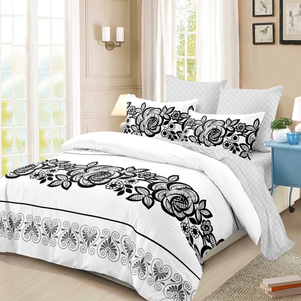 Lenjerie Pat Dublu, FINET, 6 piese, Alb, Negru, Gri, Flori, Inimioare, Super Design Pucioasa, cod produs: SDP-FNC-625