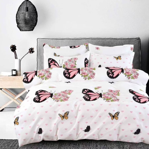 Lenjerie pat dublu, Finet, 6 piese, Alb, Roz, fluturi, Talo, cod produs: SKT-FN-38