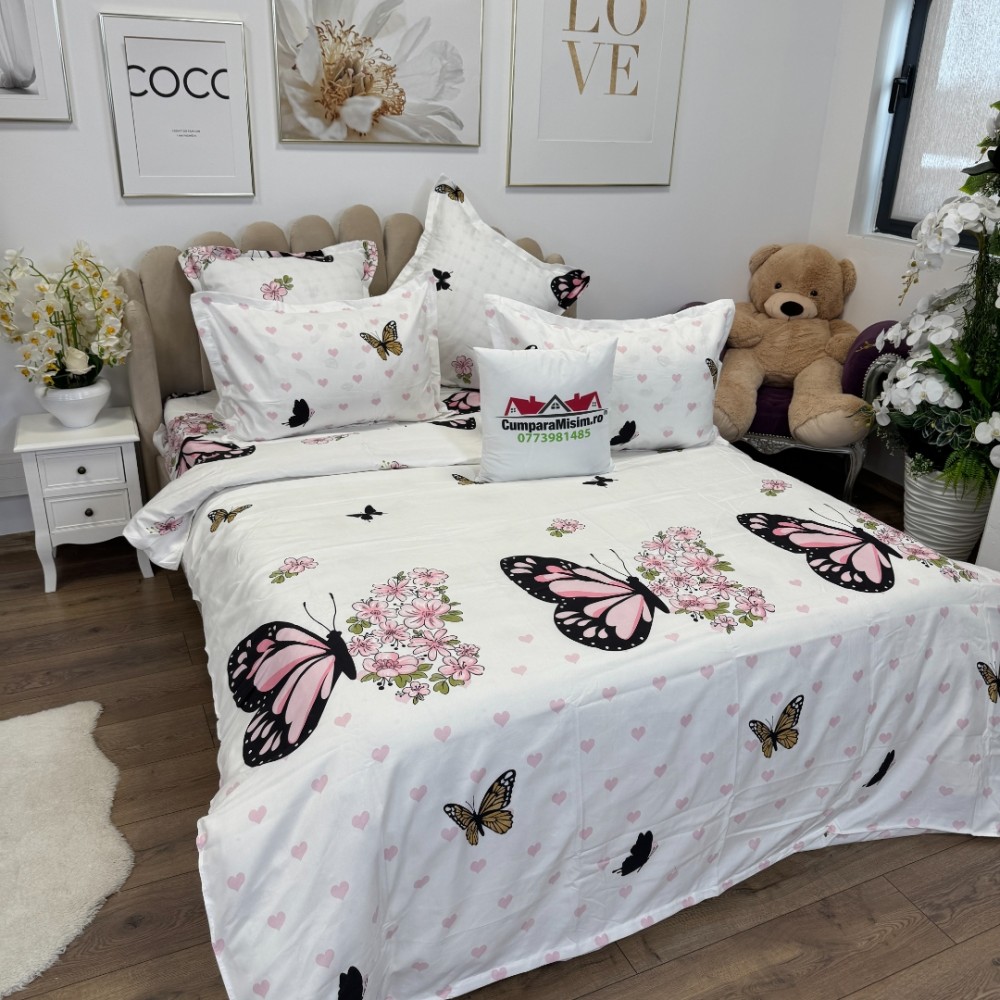 Lenjerie pat dublu, Finet, 6 piese, Alb, Roz, fluturi, Talo, cod produs: SKT-FNx-38