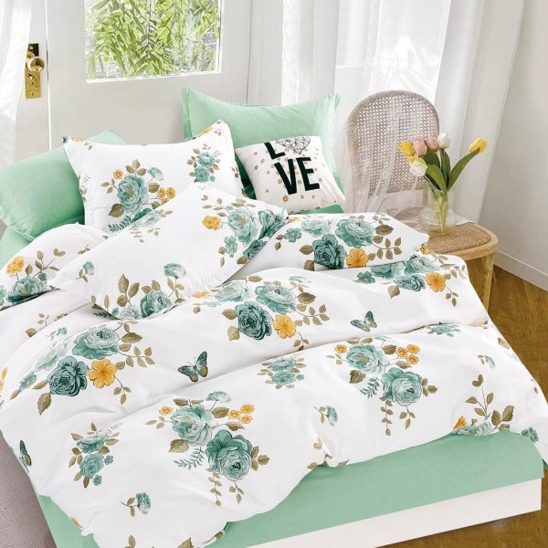 Lenjerie pat dublu, Finet, 6 piese, Alb, Verde, flori, Talo, cod produs: SKT-FN-19