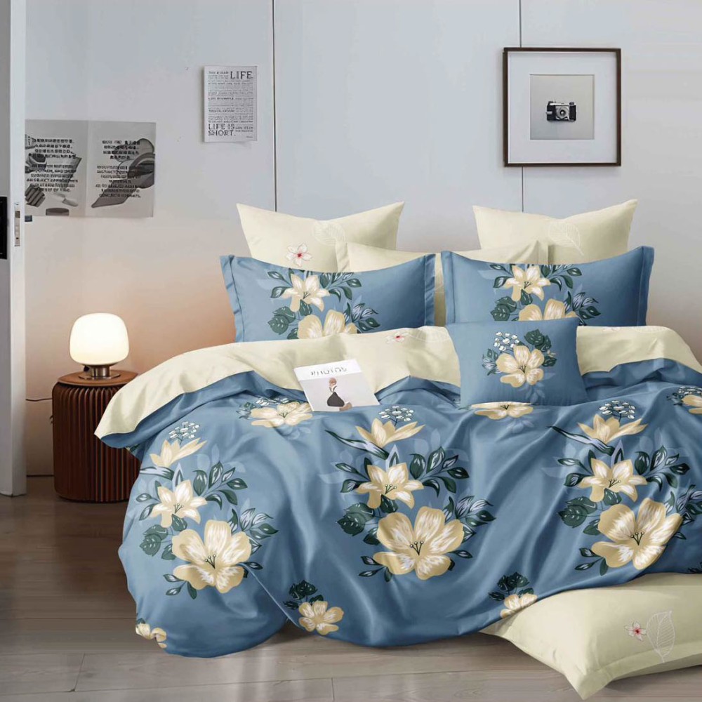 Lenjerie pat dublu, Finet, 6 piese, Albastru, Crem, flori, Talo, cod produs: SKT-FN-57