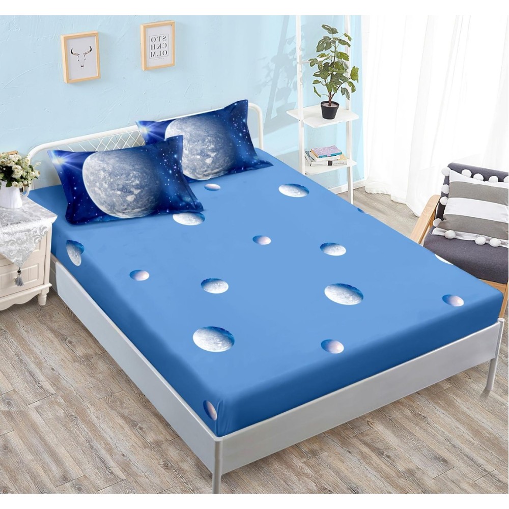 Lenjerie pat dublu cu ELASTIC, Finet, 6 piese, Albastru, planete, spatiu cosmic, Johny Home Pucioasa, cod produs: SPR-T-296