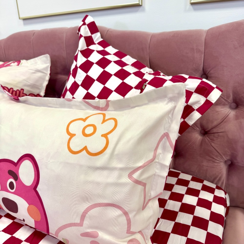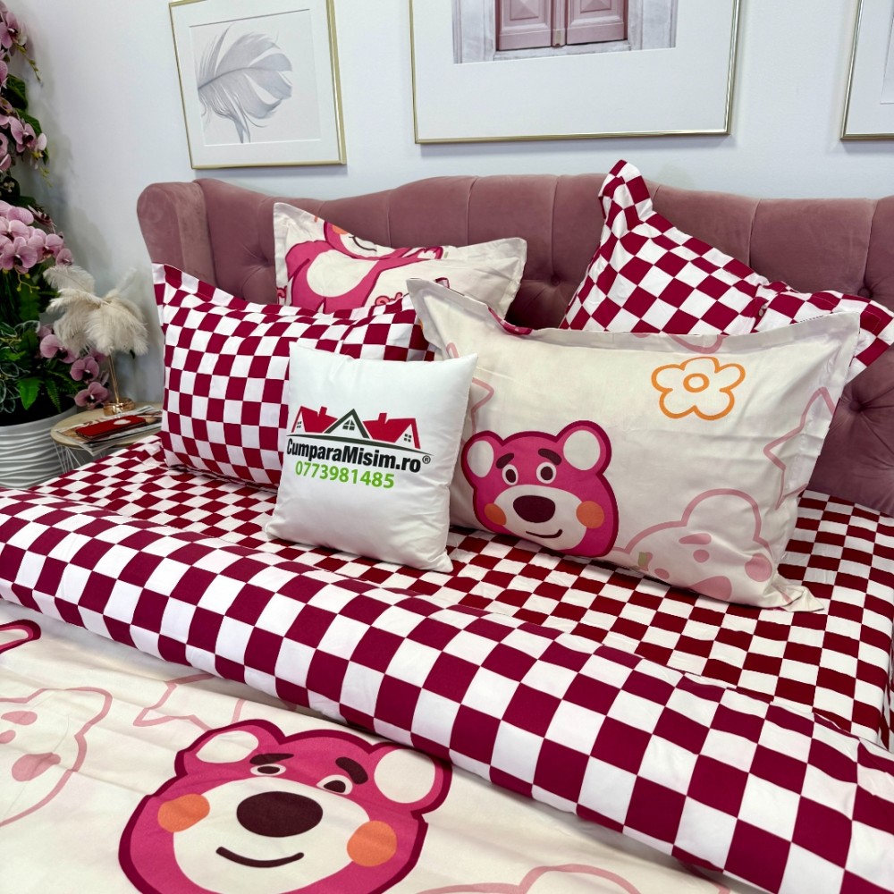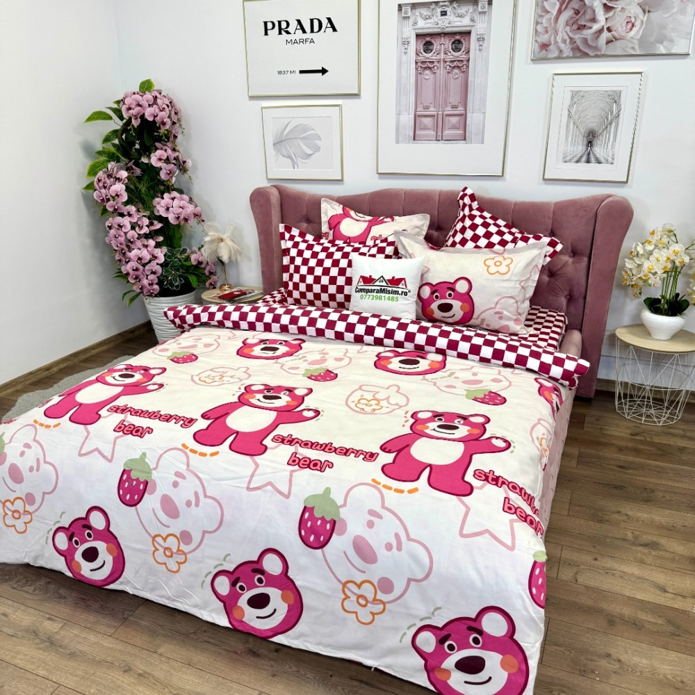 Lenjerie pat dublu, FINET, 6 piese, cu ELASTIC, Jojo Home, Crem-Rosu, ursuleti, capsune, cod produs: JOJ-FE-39