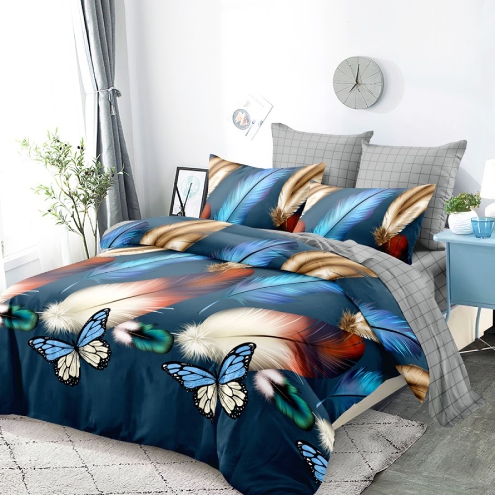 Lenjerie Pat Dublu, FINET, 6 piese, Gri, Albastru, Pene, Fluturi, Super Design Pucioasa, cod produs: SDP-FNC-630