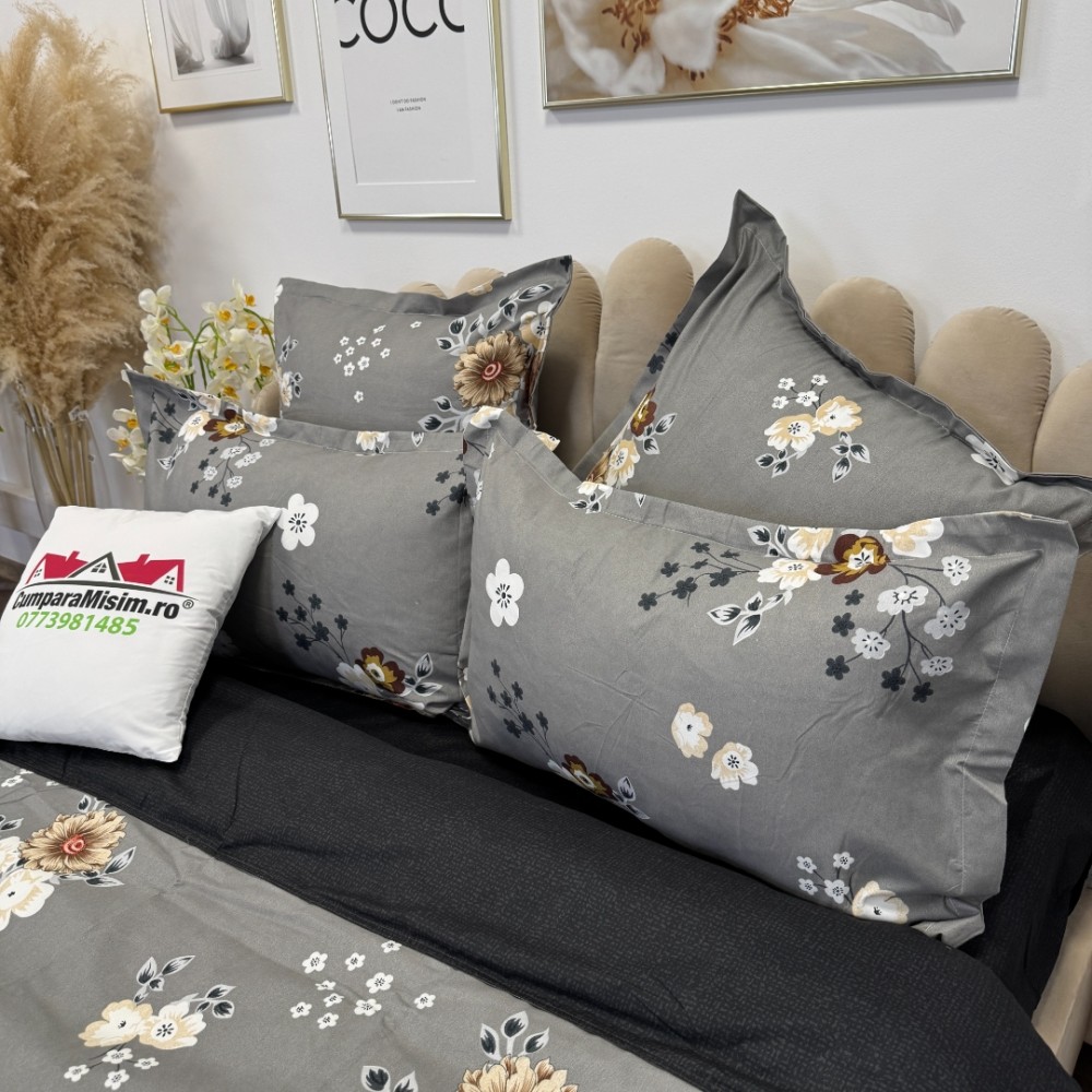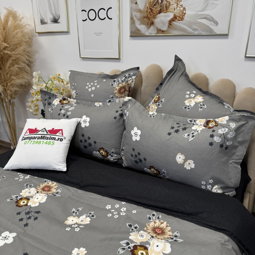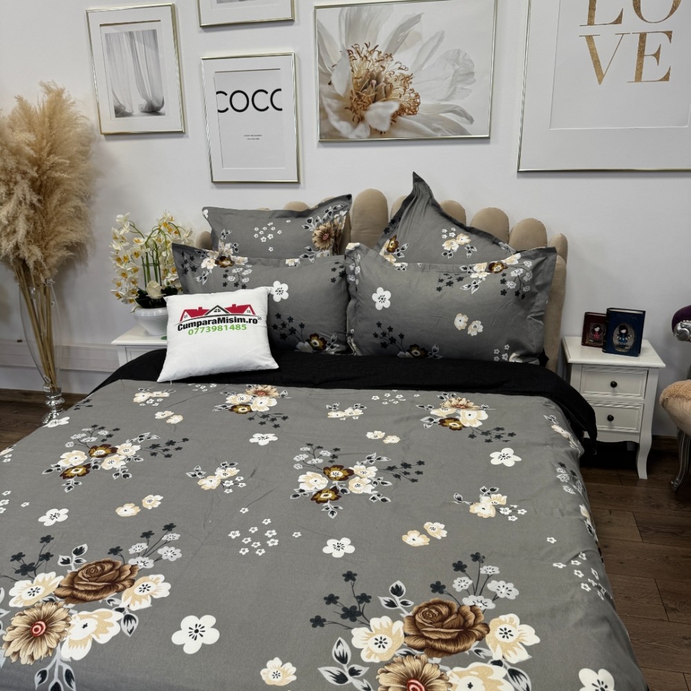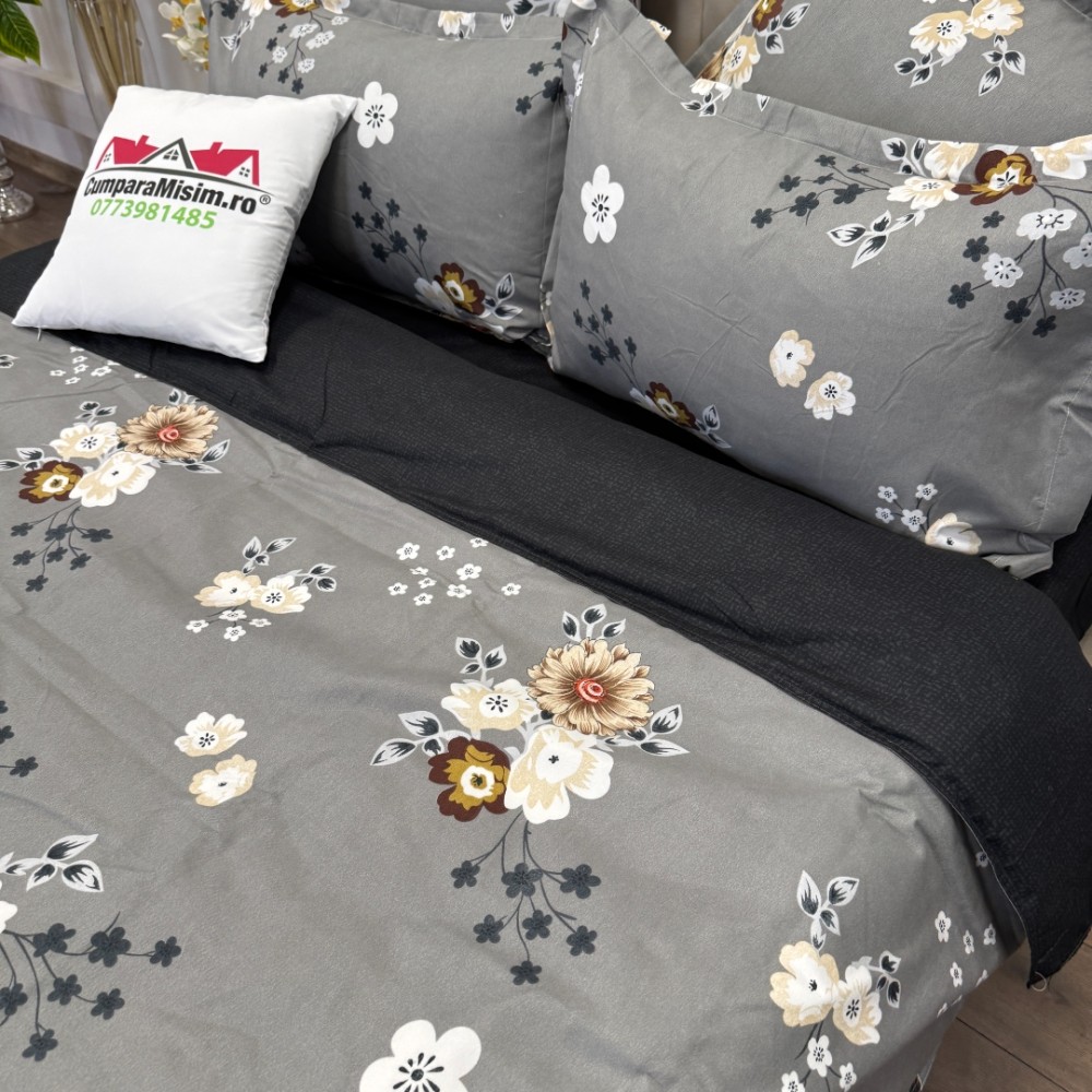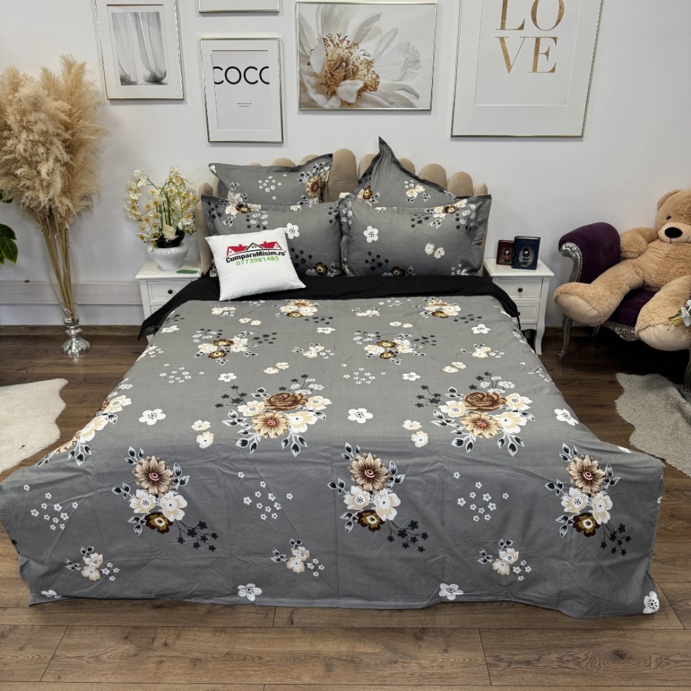 Lenjerie pat dublu, Finet, 6 piese, Gri, floricele, Talo, cod produs: SKT-FN-12