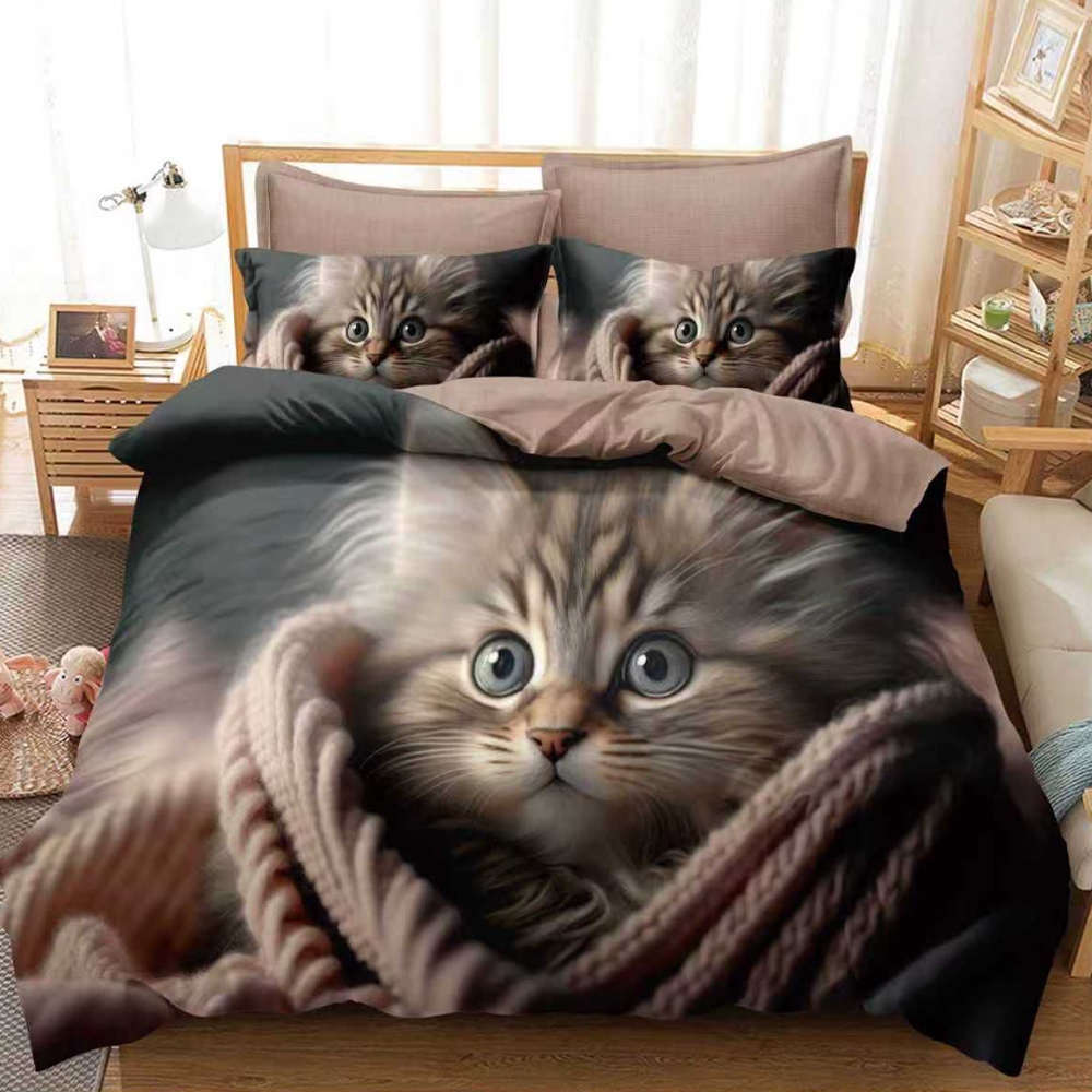 Lenjerie pat dublu, FINET, 6 piese, IDENTICA CU POZA, Bej, pisica, Johny Home Pucioasa, cod produs: SPR-Q2a-46