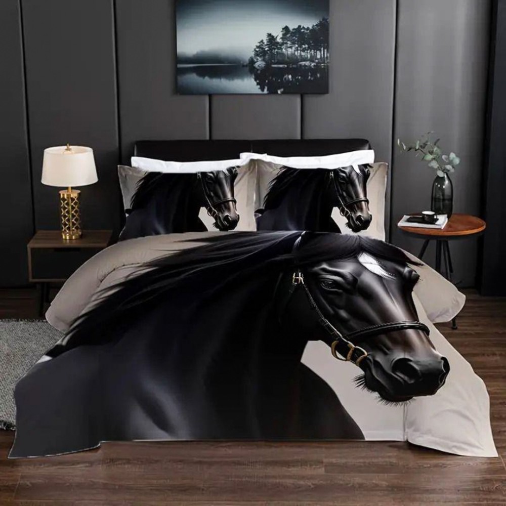Lenjerie pat dublu, FINET, 6 piese, IDENTICA CU POZA, cu Imprimeu Digital, Gri, Negru, Cal, Casa Minunata, cod produs: YN-LDF-11