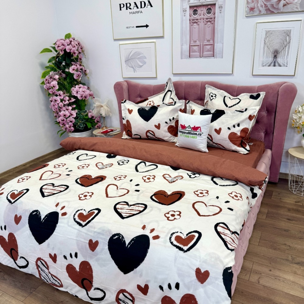 Lenjerie pat dublu, FINET, 6 piese, Jojo Home, Crem, inimioare, cod produs: JOJ-FN-77