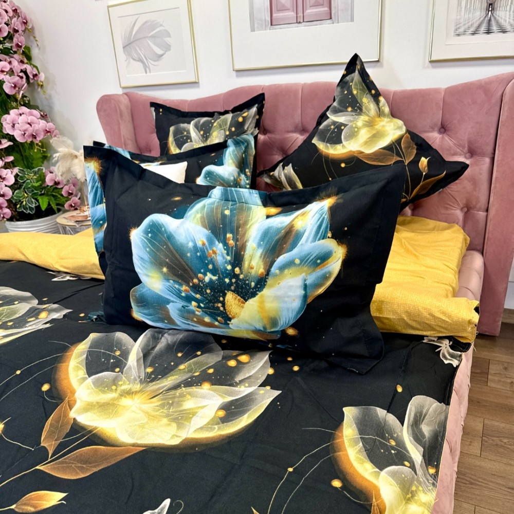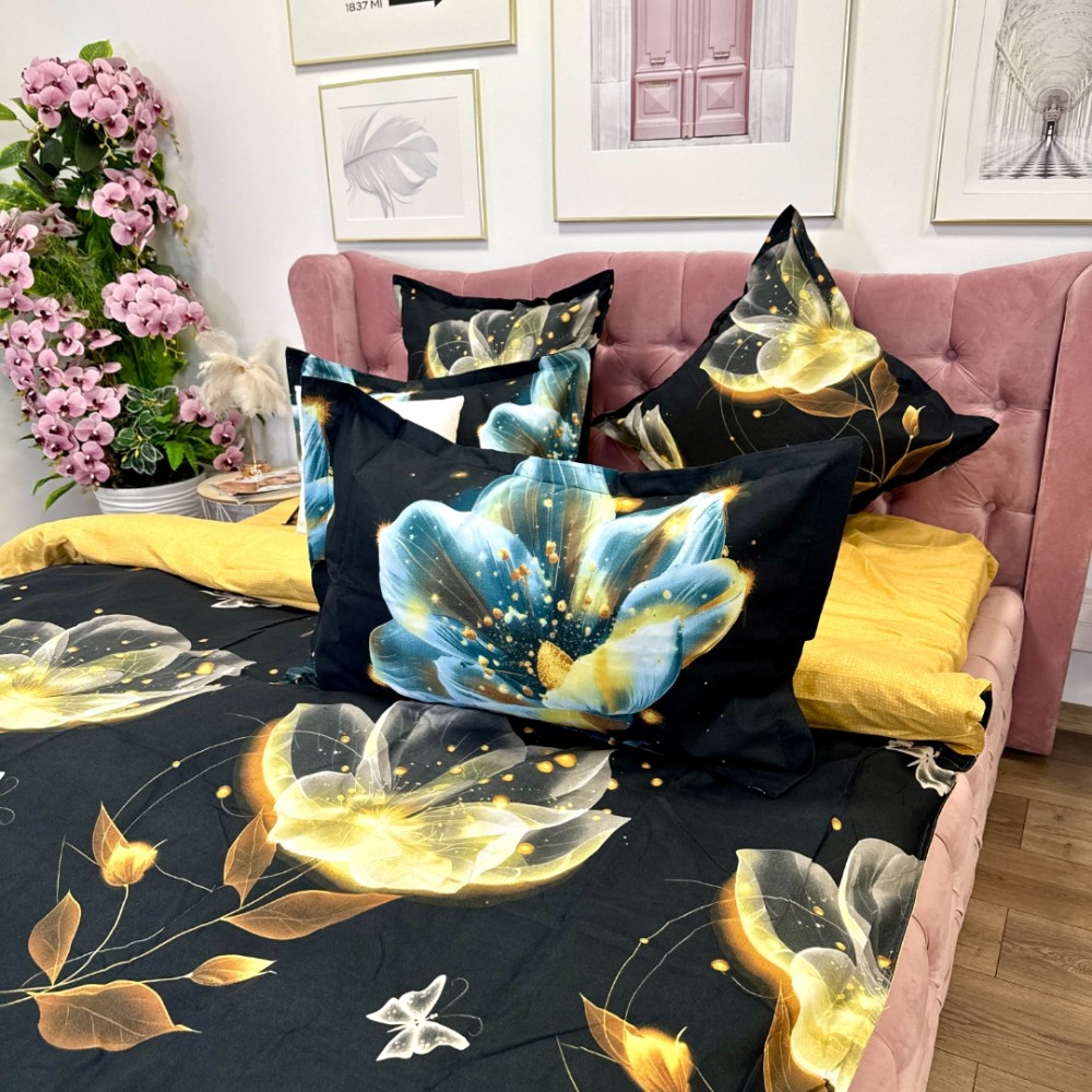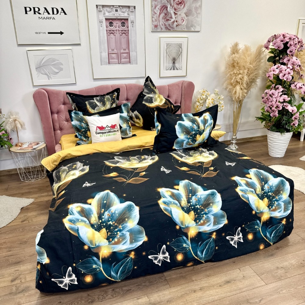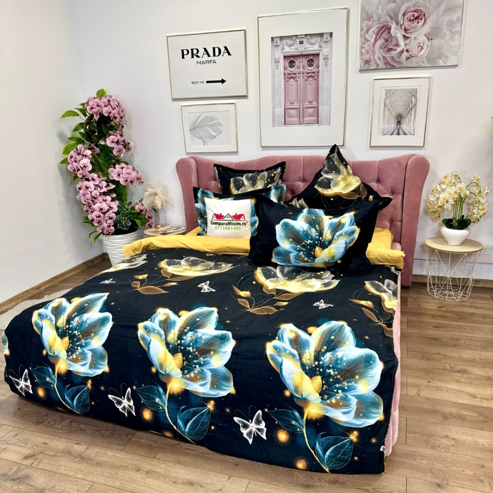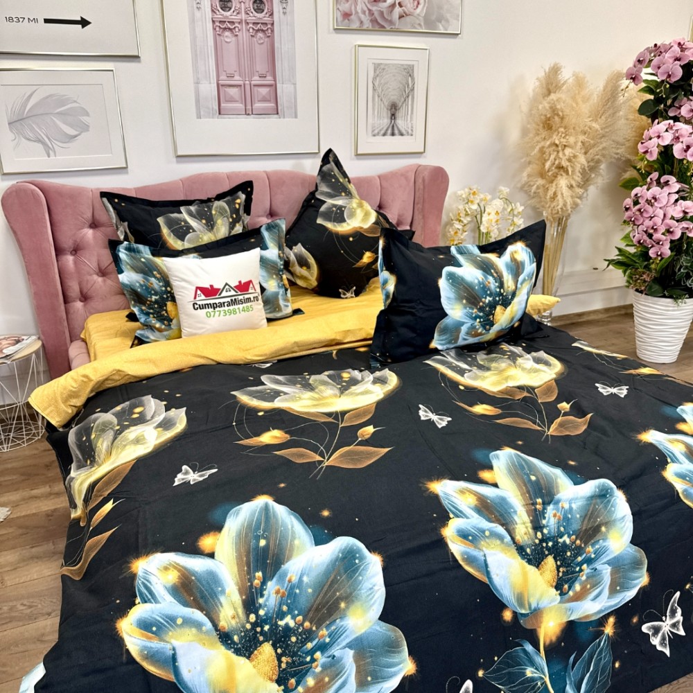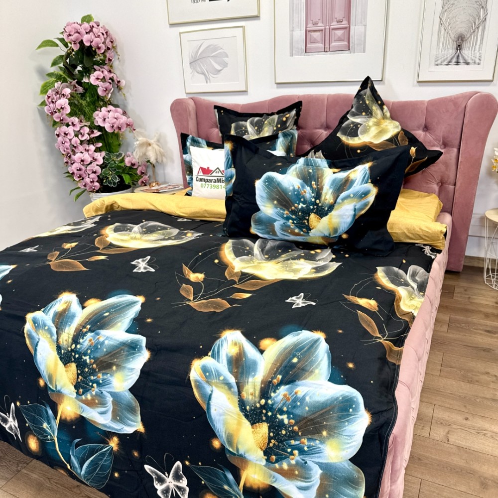 Lenjerie pat dublu, Finet, 6 piese, Negru, flori, Talo, cod produs: SKT-FN-08