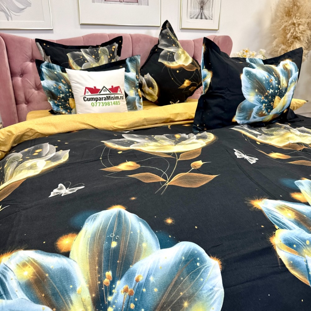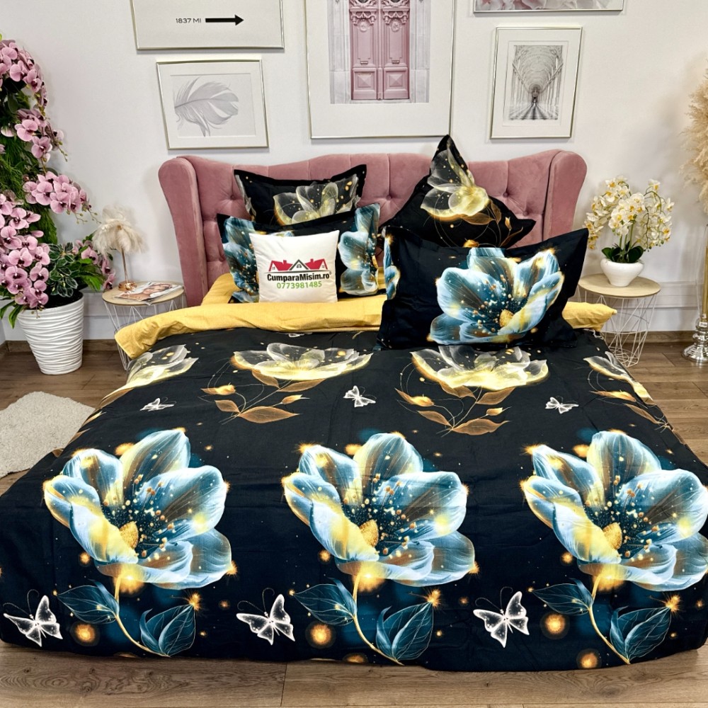Lenjerie pat dublu, Finet, 6 piese, Negru, flori, Talo, cod produs: SKT-FNx-08