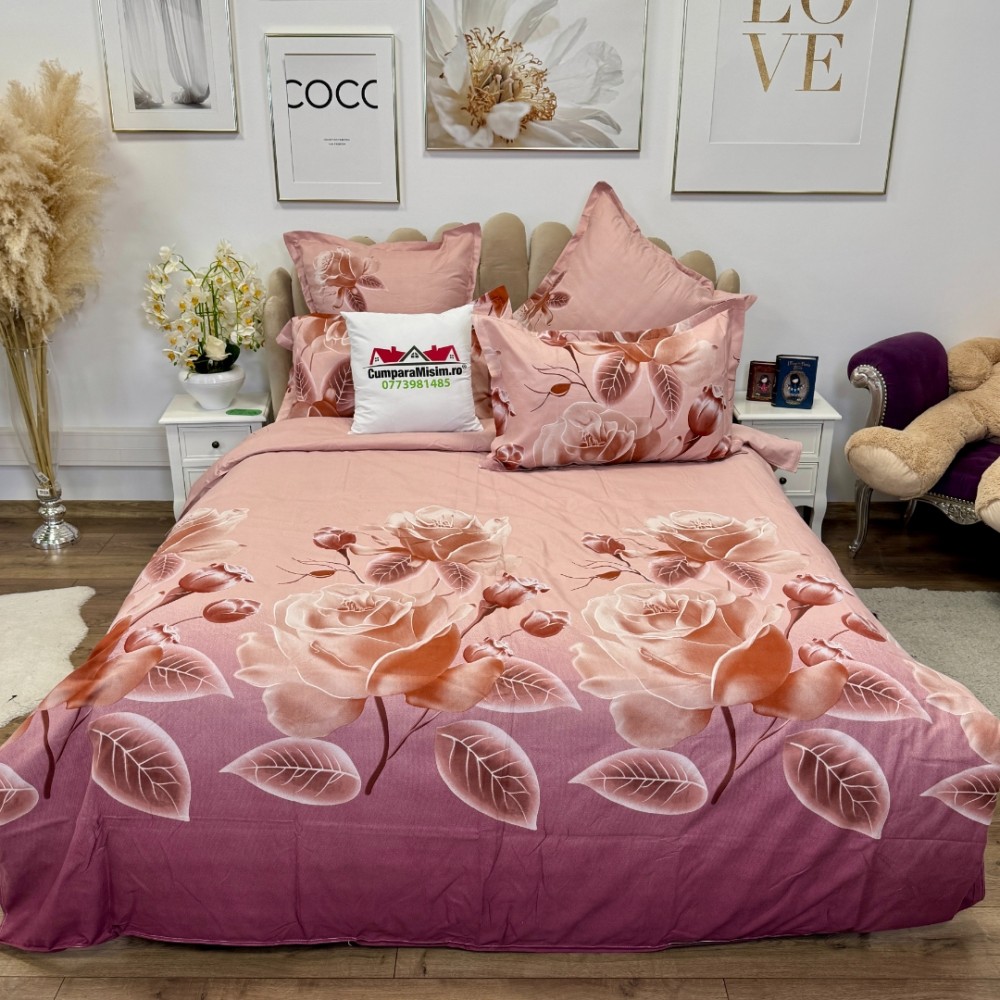 Lenjerie pat dublu, Finet, 6 piese, Roz, flori, Talo, cod produs: SKT-FNx-28