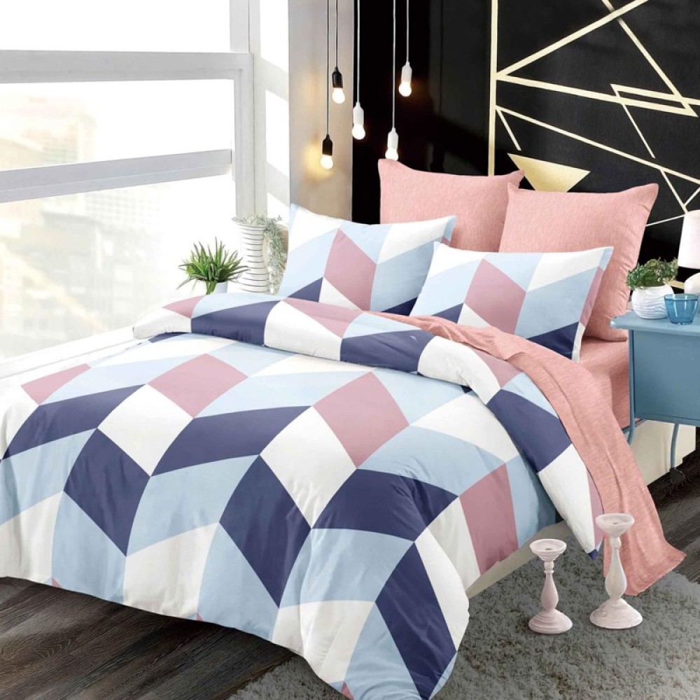 Lenjerie pat dublu, FINET, cu elastic, 6 piese, Alb, Albastru, Roz, Forme Geometrice, Primavara Casa, cod produs: PRM-FE-B6052