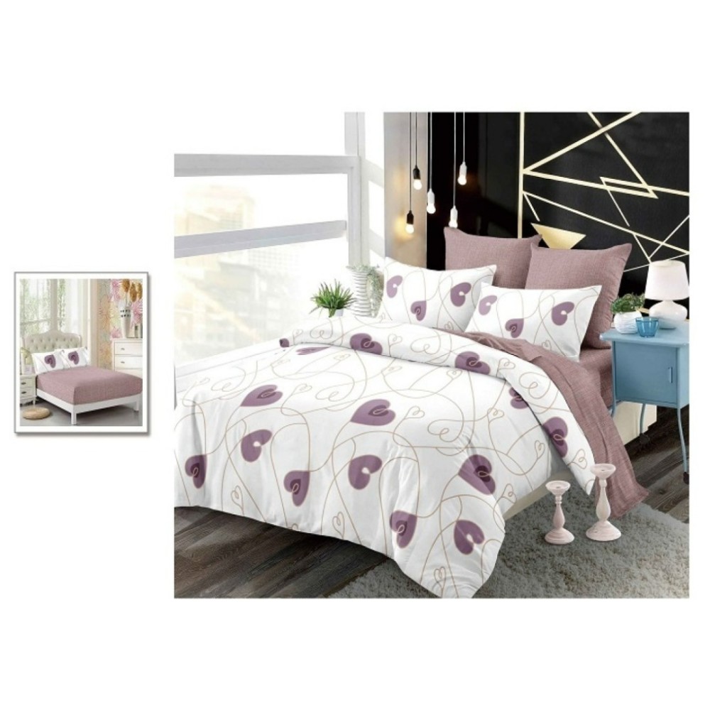 Lenjerie pat dublu, FINET, cu elastic, 6 piese, Alb, Mov, Inimioare, Primavara Casa, cod produs: PRM-FE-B6033