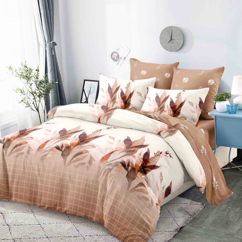 Lenjerie pat dublu, FINET, cu elastic, 6 piese, Bej, Maro, Degrade, Frunze, Super Design Pucioasa, cod produs: SDP-FEB-612