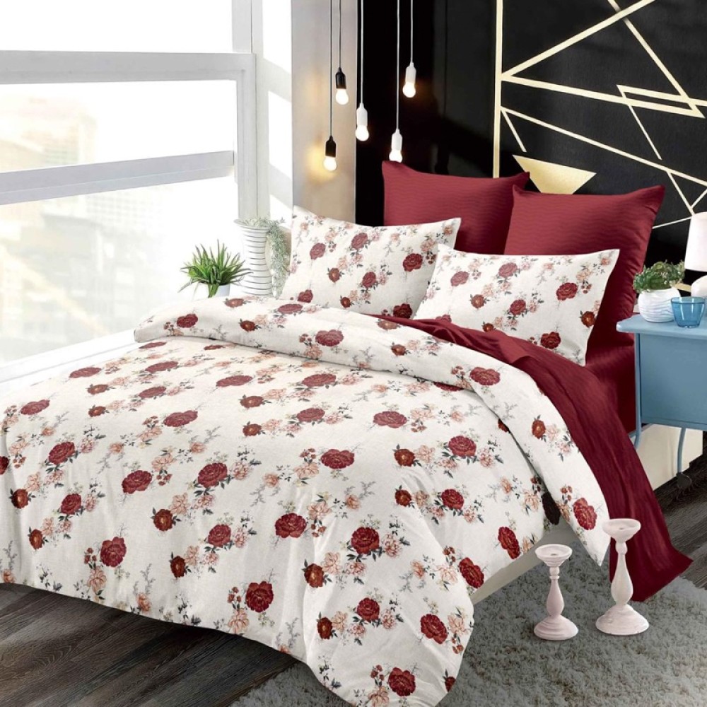 Lenjerie pat dublu, FINET, cu elastic, 6 piese, Crem, Grena, Trandafiri, Primavara Casa, cod produs: PRM-FE-B6056