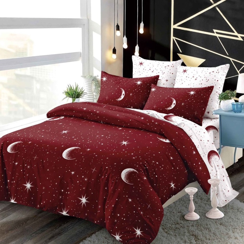 Lenjerie pat dublu, FINET, cu elastic, 6 piese, Vișiniu, Alb, Steluțe si Luna, Primavara Casa, cod produs: PRM-FE-B6083