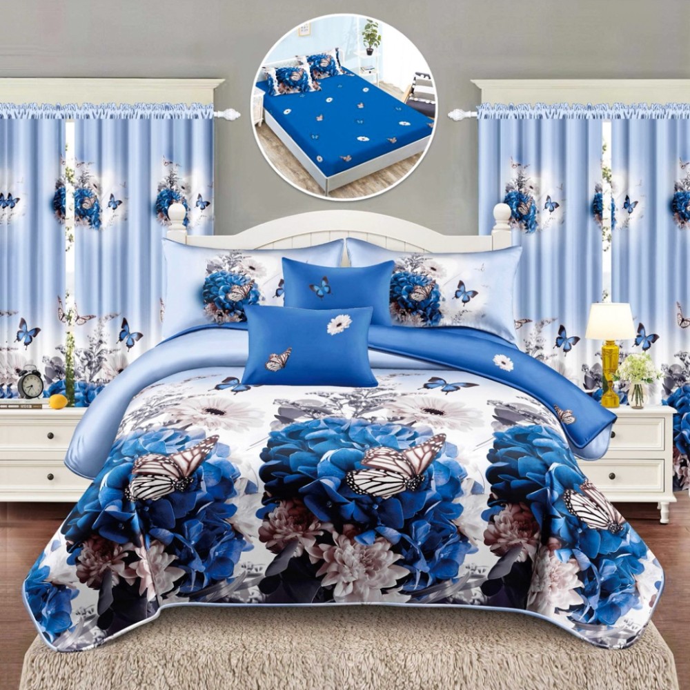 Set Lenjerie pat dublu cu Elastic (160x200cm, 180x200cm) + 2 draperii, finet, 8 piese, Alb, Albastru, Flori, Fluturi, Johny Home Pucioasa, cod produs: SPR-SE-24