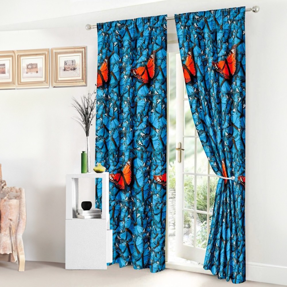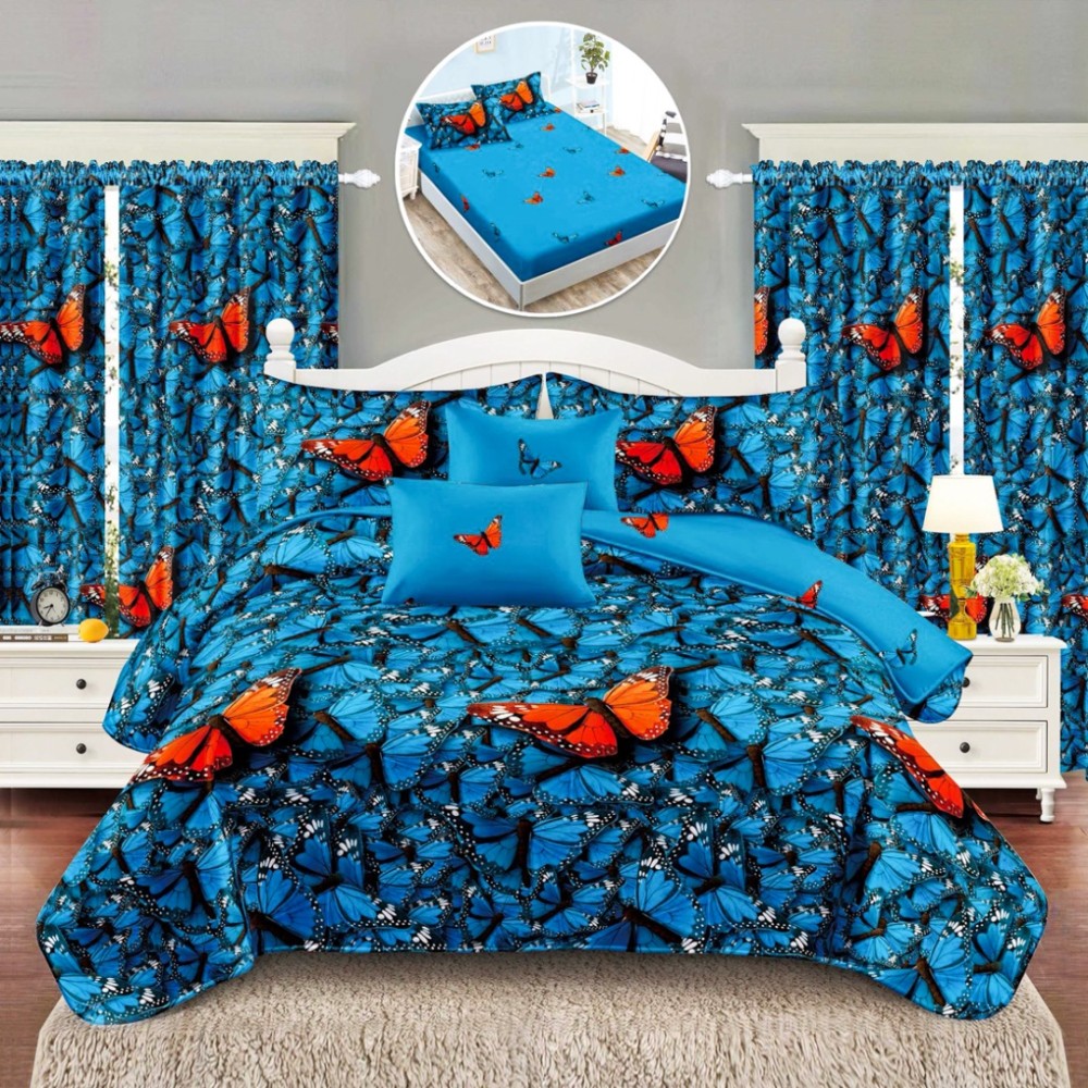 Set Lenjerie pat dublu cu Elastic (160x200cm, 180x200cm) + 2 draperii, finet, 8 piese, Albastru, Fluturi, Johny Home Pucioasa, cod produs: SPR-SE-22