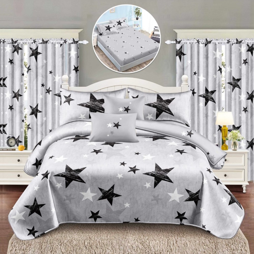 Set Lenjerie pat dublu cu Elastic (160x200cm, 180x200cm) + 2 draperii, finet, 8 piese, Gri, stelute, Johny Home Pucioasa, cod produs: SPR-SE-10