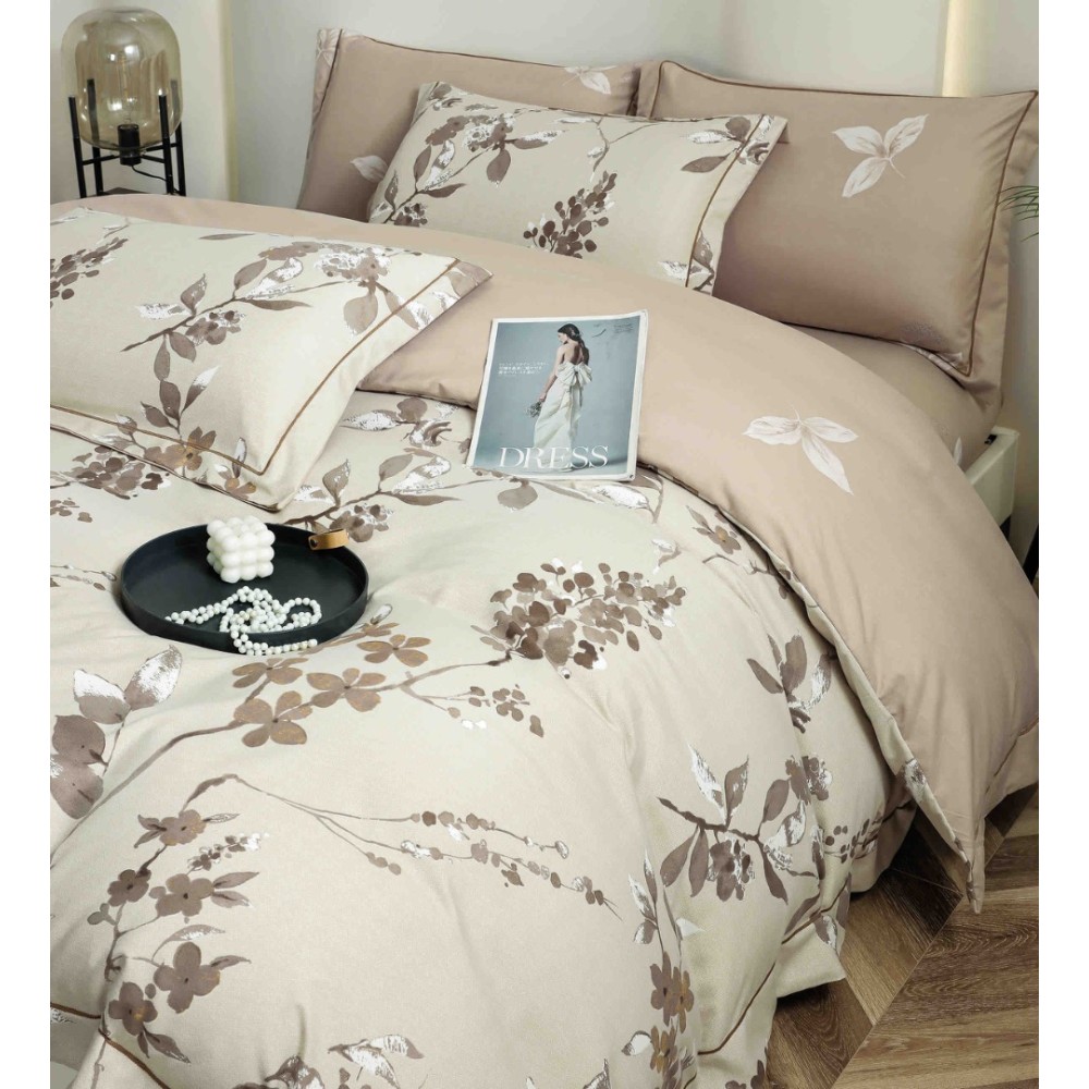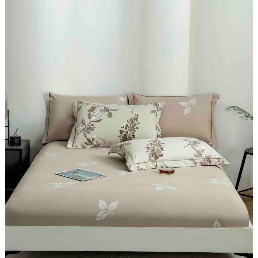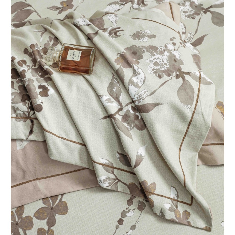 Lenjerie pat dublu, FINET DeLuxe, 6 piese, cu ELASTIC, Jojo Home, Cutie Eleganta, Bej, Flori, cod produs: JOJ-LXC-01