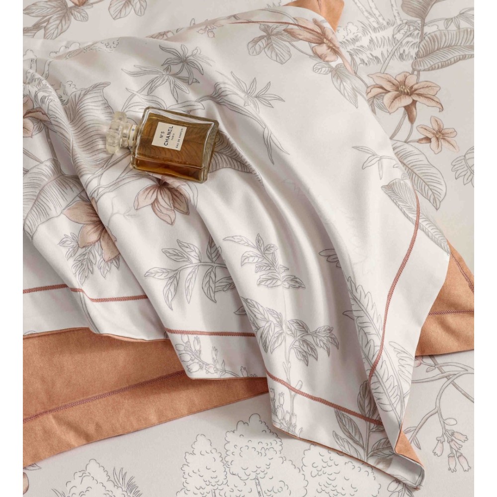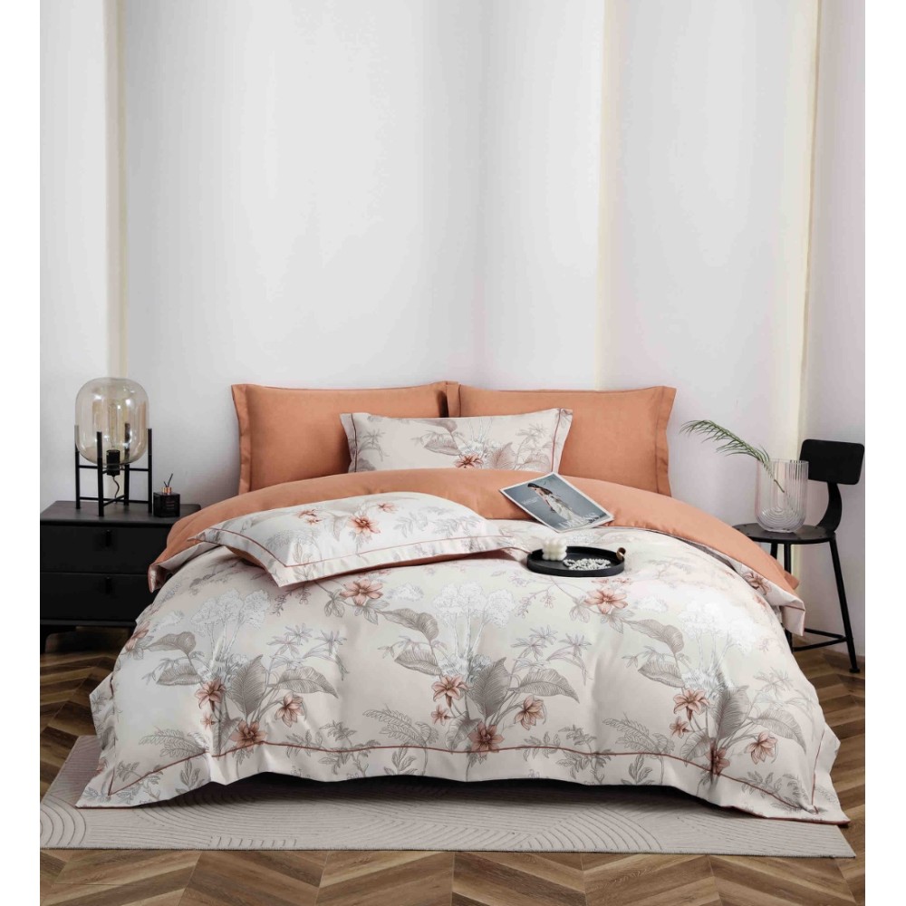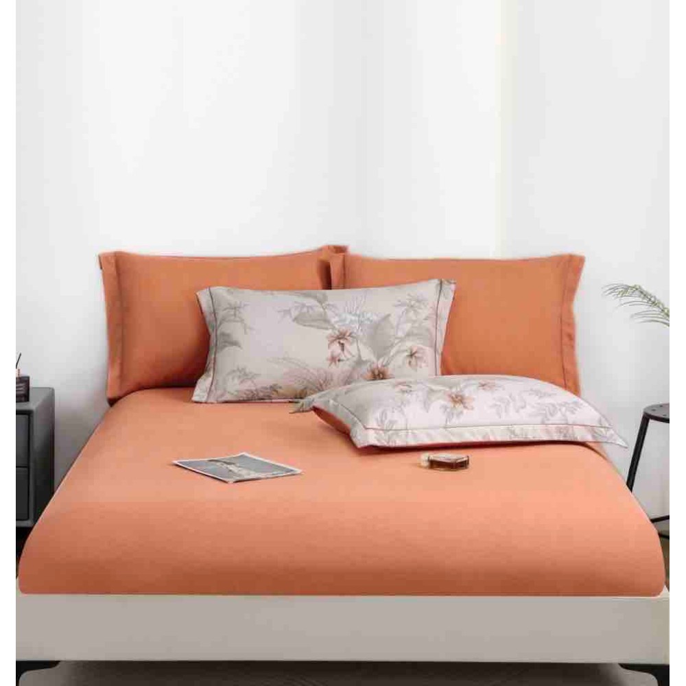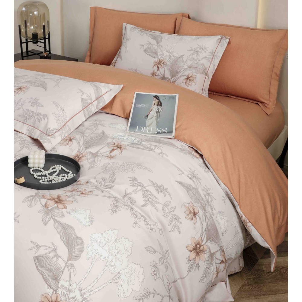 Lenjerie pat dublu, FINET DeLuxe, 6 piese, cu ELASTIC, Jojo Home, Cutie Eleganta, Bej, Portocaliu,Flori, cod produs: JOJ-LXC-10