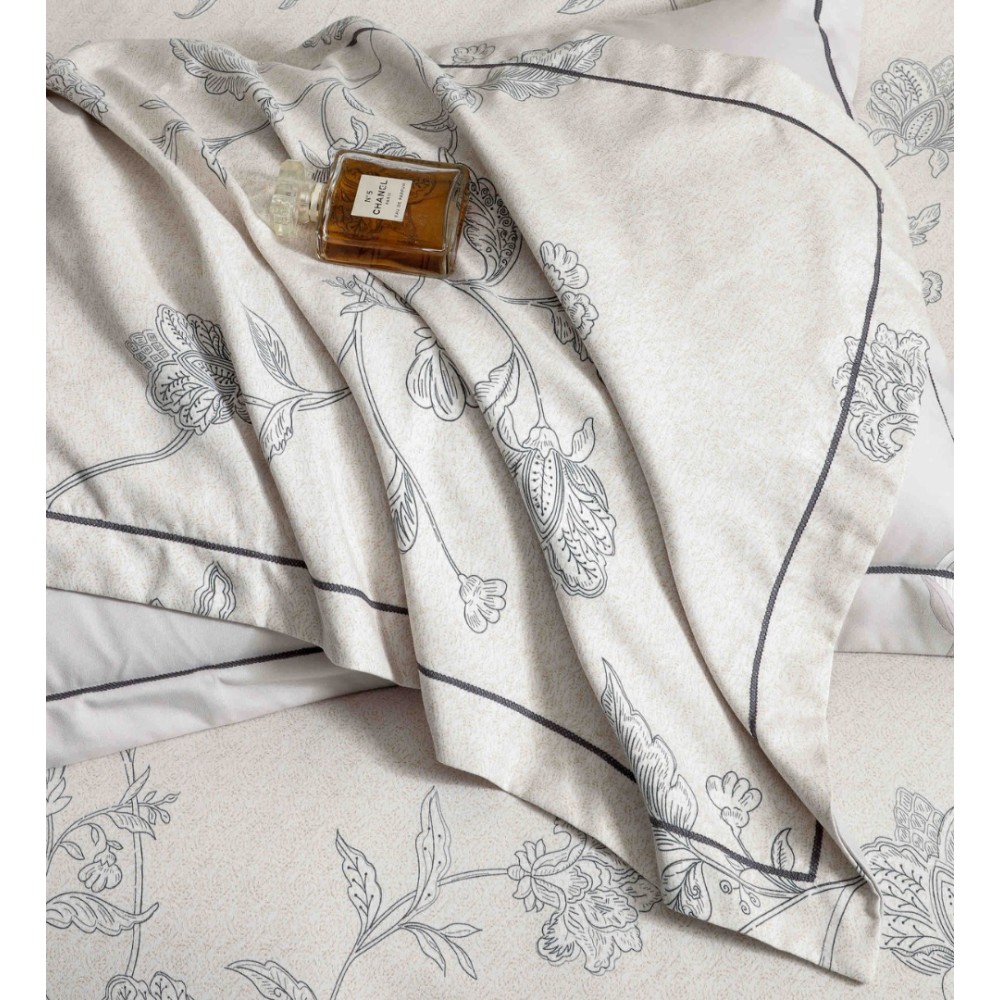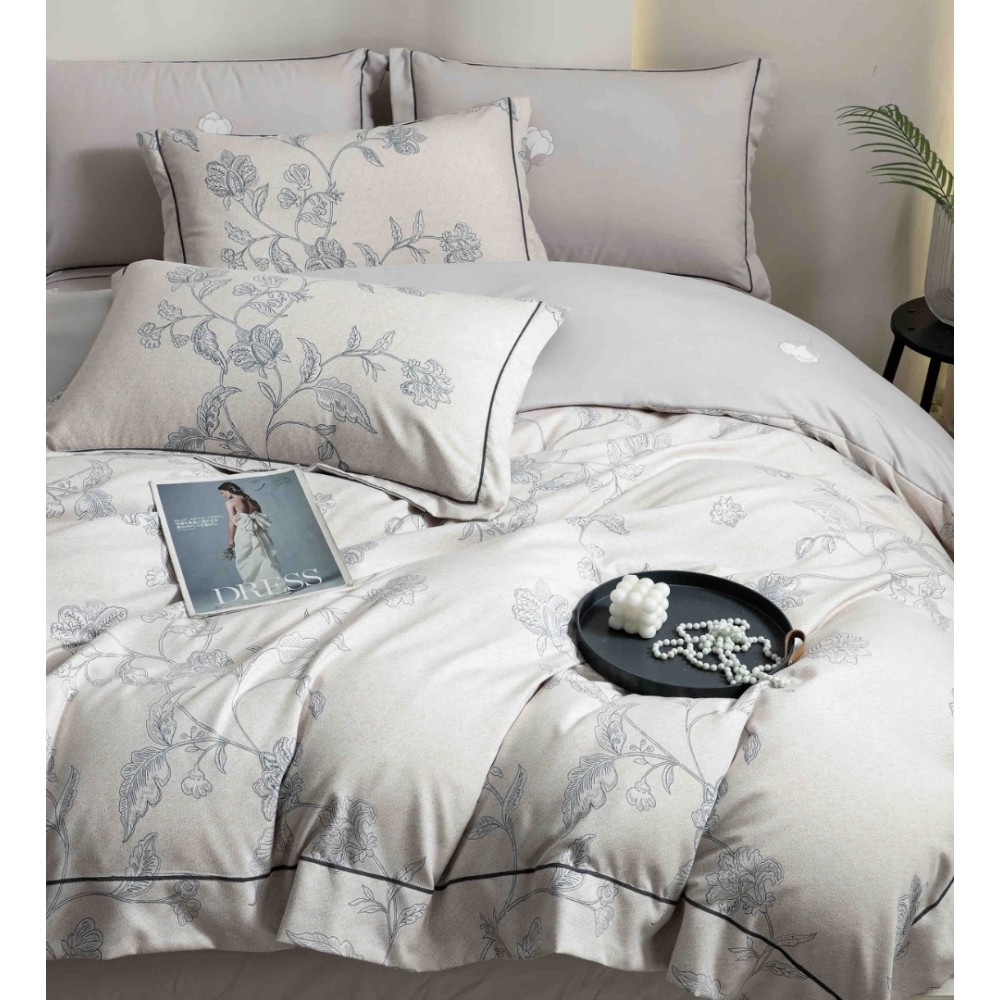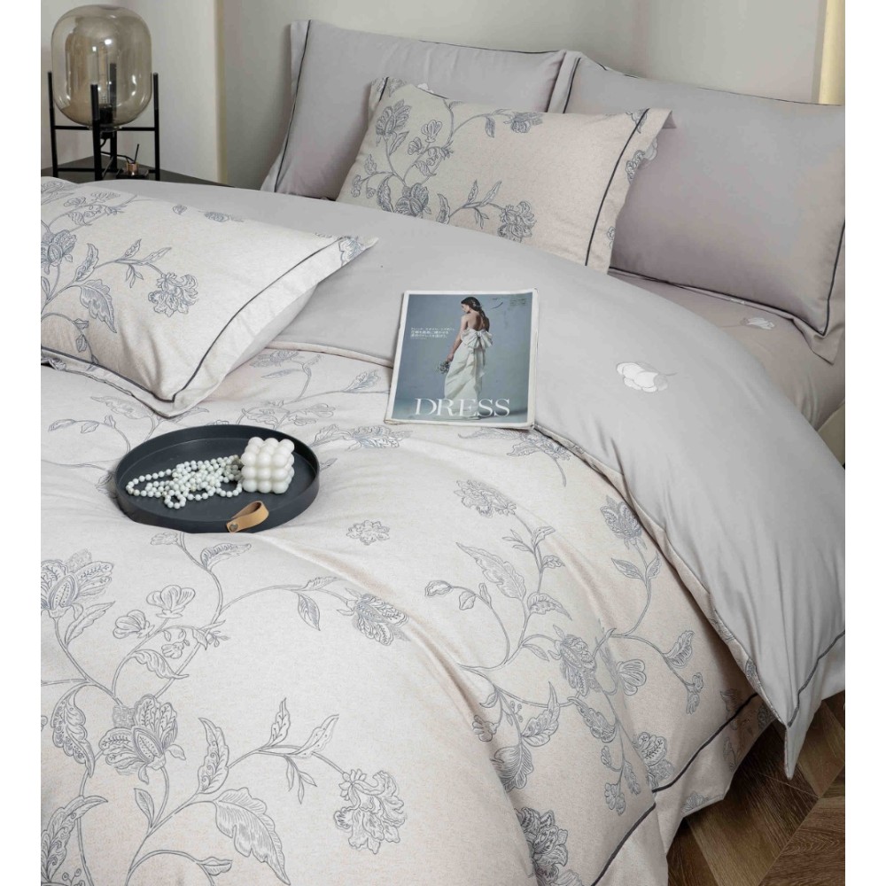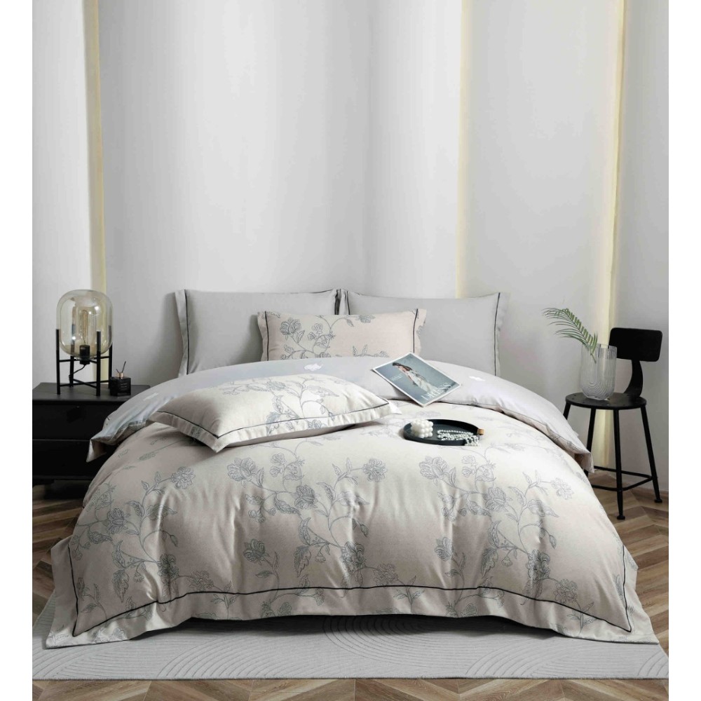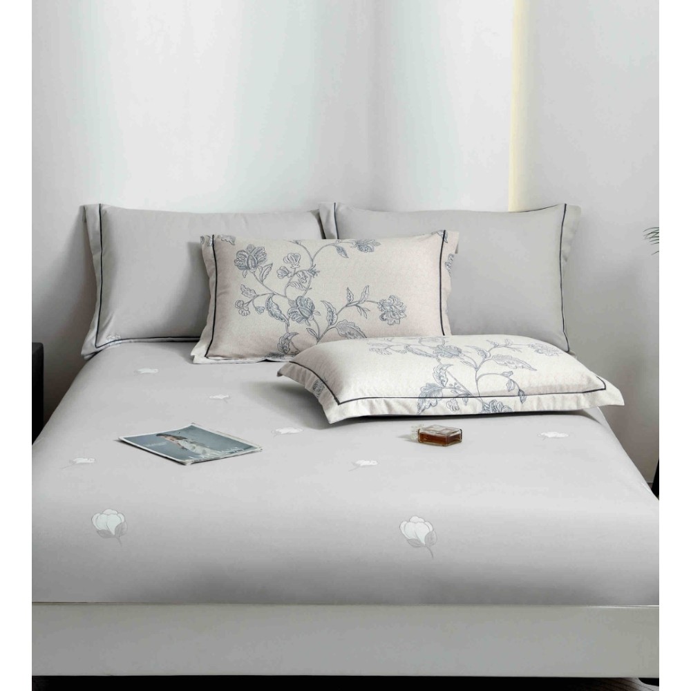 Lenjerie pat dublu, FINET DeLuxe, 6 piese, cu ELASTIC, Jojo Home, Cutie Eleganta, Grej, Bleu, Flori, cod produs: JOJ-LXC-14