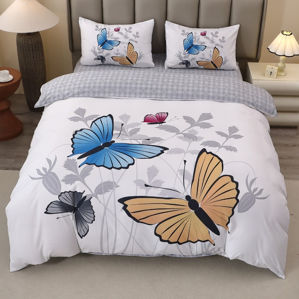 Lenjerie pat dublu, FINET, Imprimeu Digital 5D - Identic cu poza, Cu ELASTIC, 4 piese, Alb, Gri, Fluturi, cod produs: BCC-5DF-08