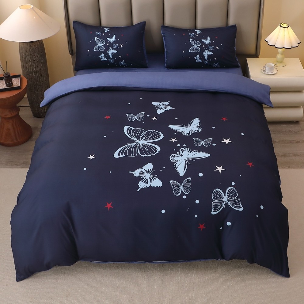 Lenjerie pat dublu, FINET, Imprimeu Digital 5D - Identic cu poza, Cu ELASTIC, 4 piese, Alb, Gri, Fluturi, cod produs: BCC-5DF-09