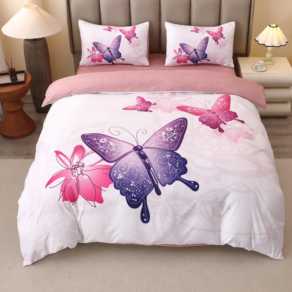 Lenjerie pat dublu, FINET, Imprimeu Digital 5D - Identic cu poza, Cu ELASTIC, 4 piese, Alb, Roz, Fluturi, cod produs: BCC-5DF-16