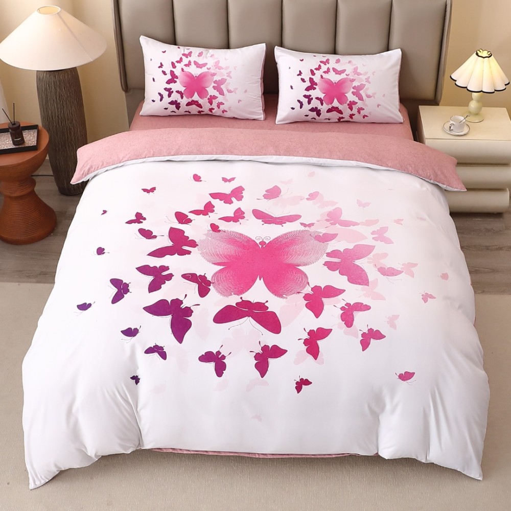 Lenjerie pat dublu, FINET, Imprimeu Digital 5D - Identic cu poza, Cu ELASTIC, 4 piese, Alb, Roz, Fluturi , cod produs: BCC-5DF-36
