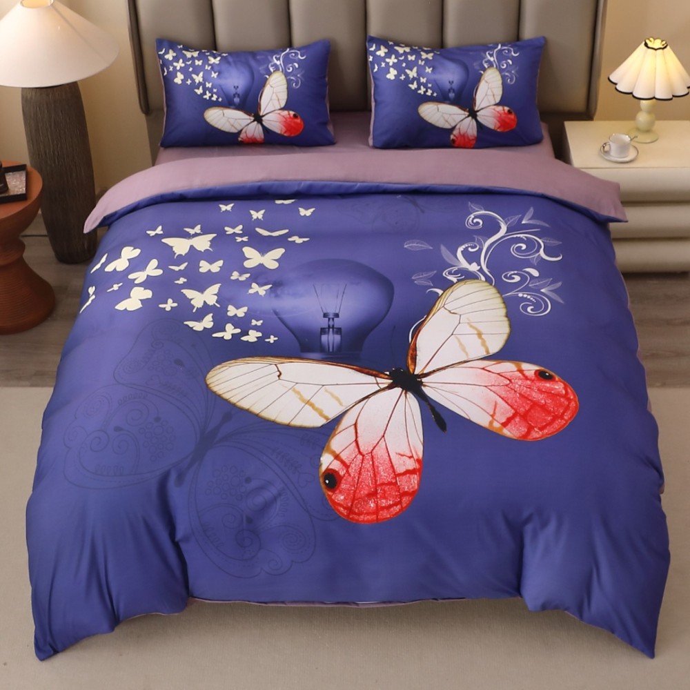 Lenjerie pat dublu, FINET, Imprimeu Digital 5D - Identic cu poza, Cu ELASTIC, 4 piese, Albastru, Fluturi, cod produs: BCC-5DF-01