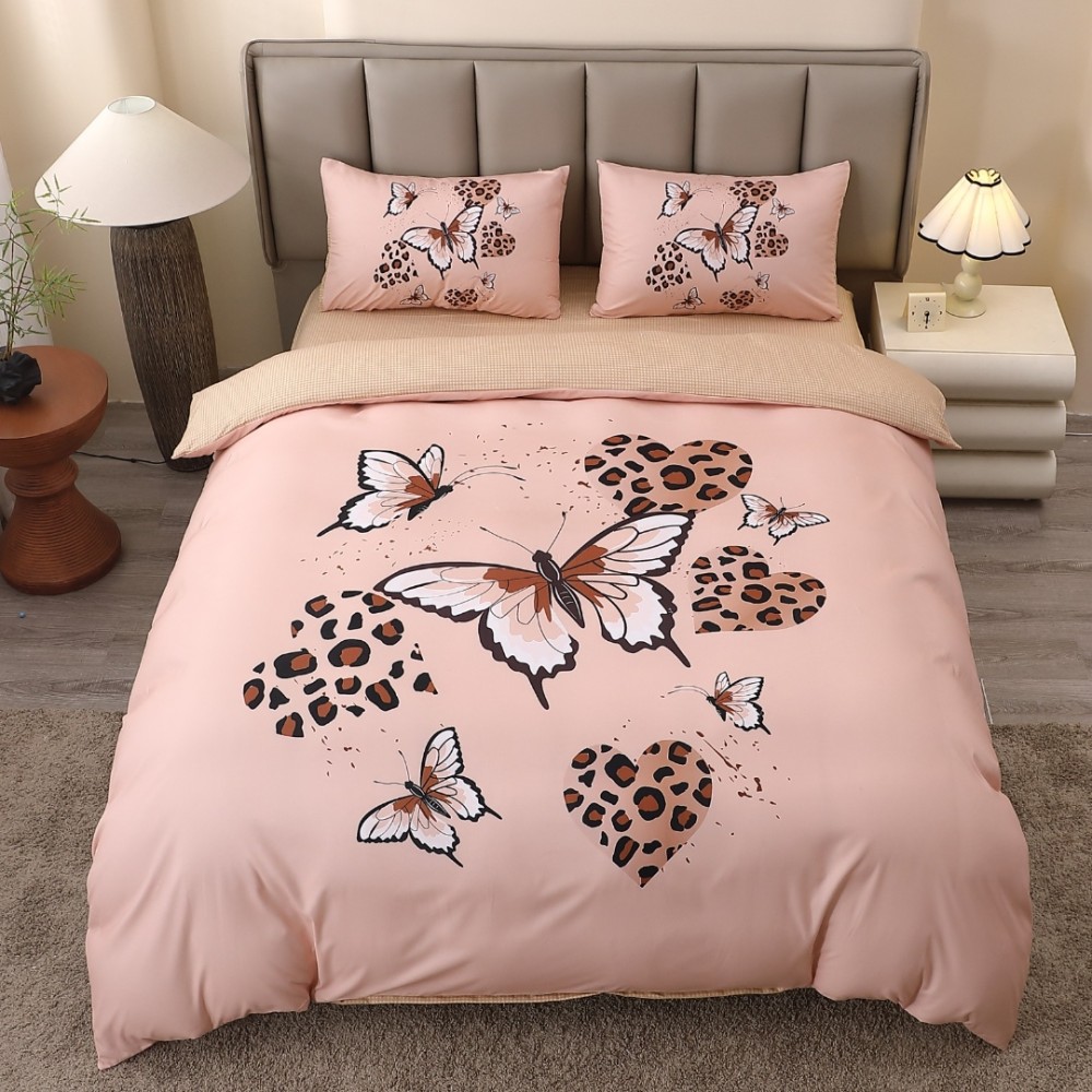 Lenjerie pat dublu, FINET, Imprimeu Digital 5D - Identic cu poza, Cu ELASTIC, 4 piese, Bej, Fluturi si Inimioare, cod produs: BCC-5DF-28