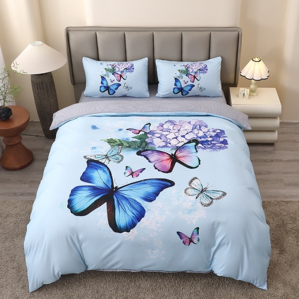 Lenjerie pat dublu, FINET, Imprimeu Digital 5D - Identic cu poza, Cu ELASTIC, 4 piese, Bleu, Fluturi si Hortensie, cod produs: BCC-5DF-35