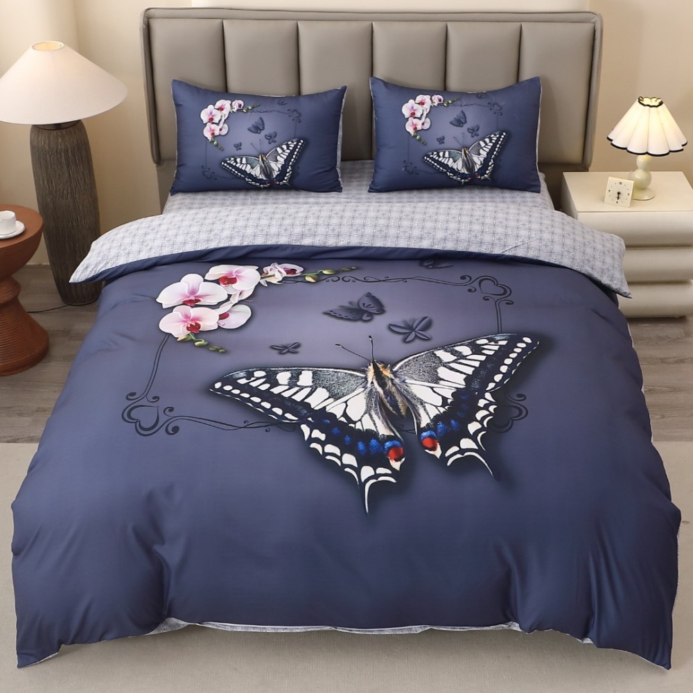 Lenjerie pat dublu, FINET, Imprimeu Digital 5D - Identic cu poza, Cu ELASTIC, 4 piese, Bleumarin, Fluturi , cod produs: BCC-5DF-39