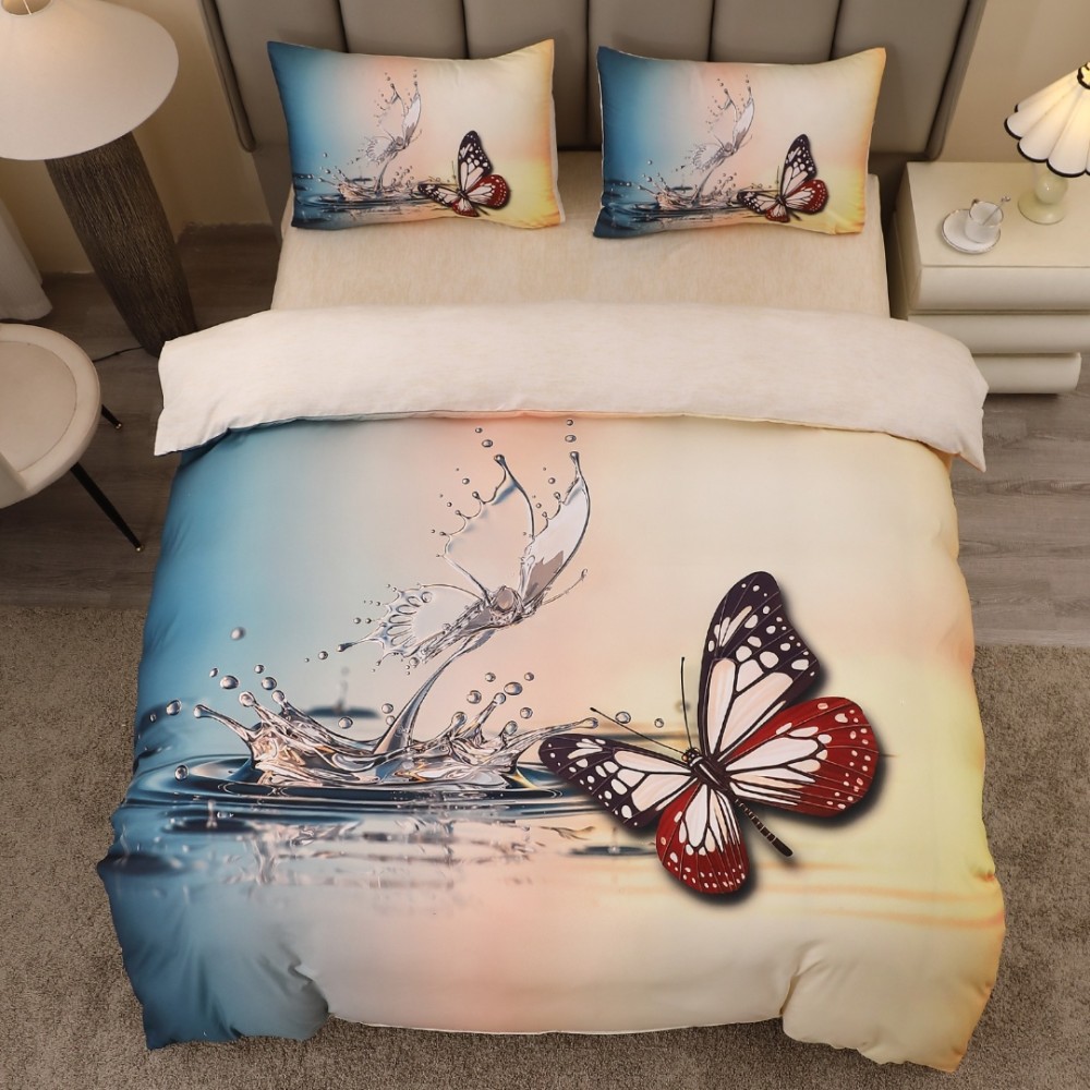 Lenjerie pat dublu, FINET, Imprimeu Digital 5D - Identic cu poza, Cu ELASTIC, 4 piese, Galben, Bleu, Fluturi, cod produs: BCC-5DF-15