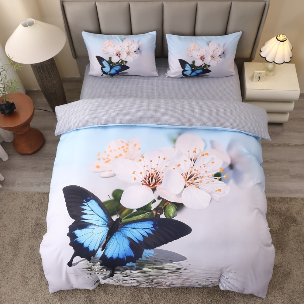 Lenjerie pat dublu, FINET, Imprimeu Digital 5D - Identic cu poza, Cu ELASTIC, 4 piese, Gri, Bleu, Fluturi, cod produs: BCC-5DF-27