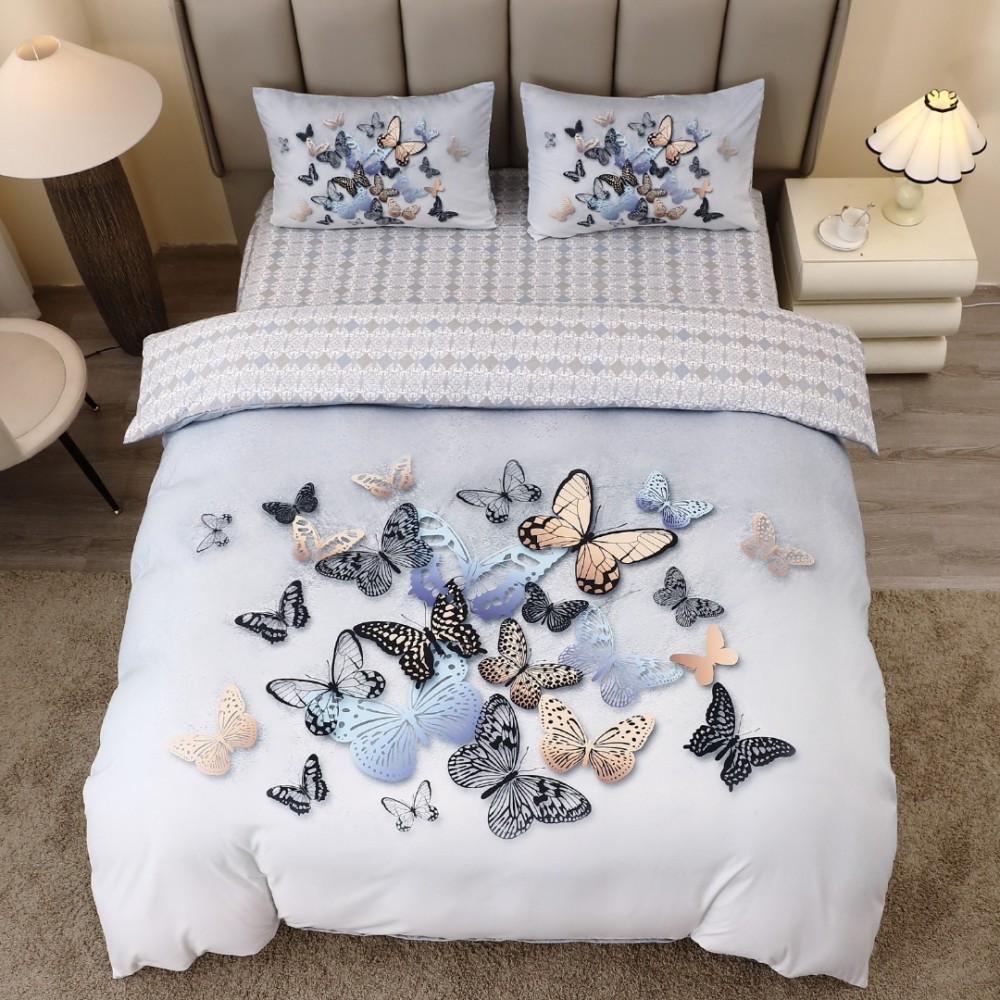 Lenjerie pat dublu, FINET, Imprimeu Digital 5D - Identic cu poza, Cu ELASTIC, 4 piese, Gri, Bleu, Fluturi, cod produs: BCC-5DF-22