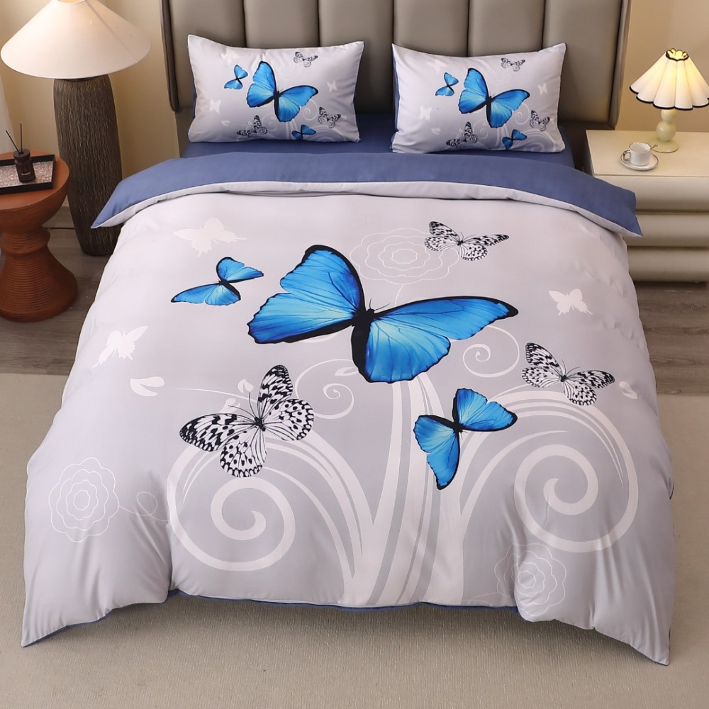 Lenjerie pat dublu, FINET, Imprimeu Digital 5D - Identic cu poza, Cu ELASTIC, 4 piese, Gri, Fluturi, cod produs: BCC-5DF-03