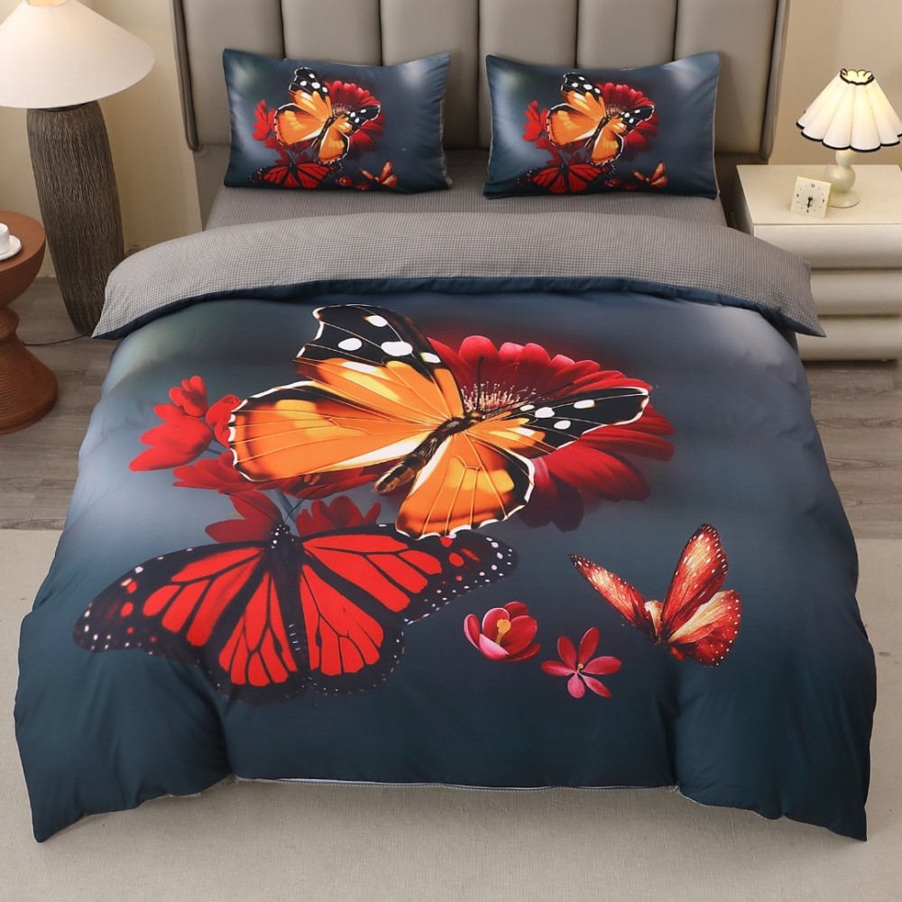 Lenjerie pat dublu, FINET, Imprimeu Digital 5D - Identic cu poza, Cu ELASTIC, 4 piese, Gri, Fluturi , cod produs: BCC-5DF-77