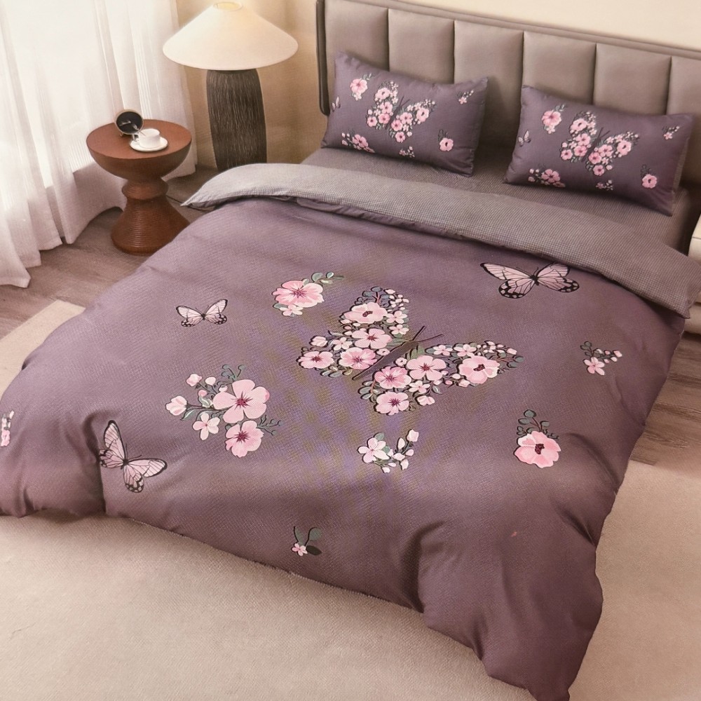 Lenjerie pat dublu, FINET, Imprimeu Digital 5D - Identic cu poza, Cu ELASTIC, 4 piese, Gri, Fluturi si Flori, cod produs: BCC-5DF-21