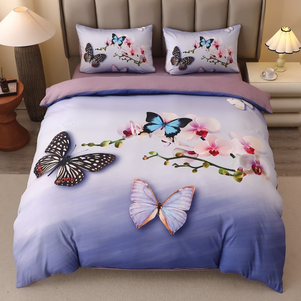 Lenjerie pat dublu, FINET, Imprimeu Digital 5D - Identic cu poza, Cu ELASTIC, 4 piese, Mov Degrade, Fluturi si Orhidee, cod produs: BCC-5DF-33