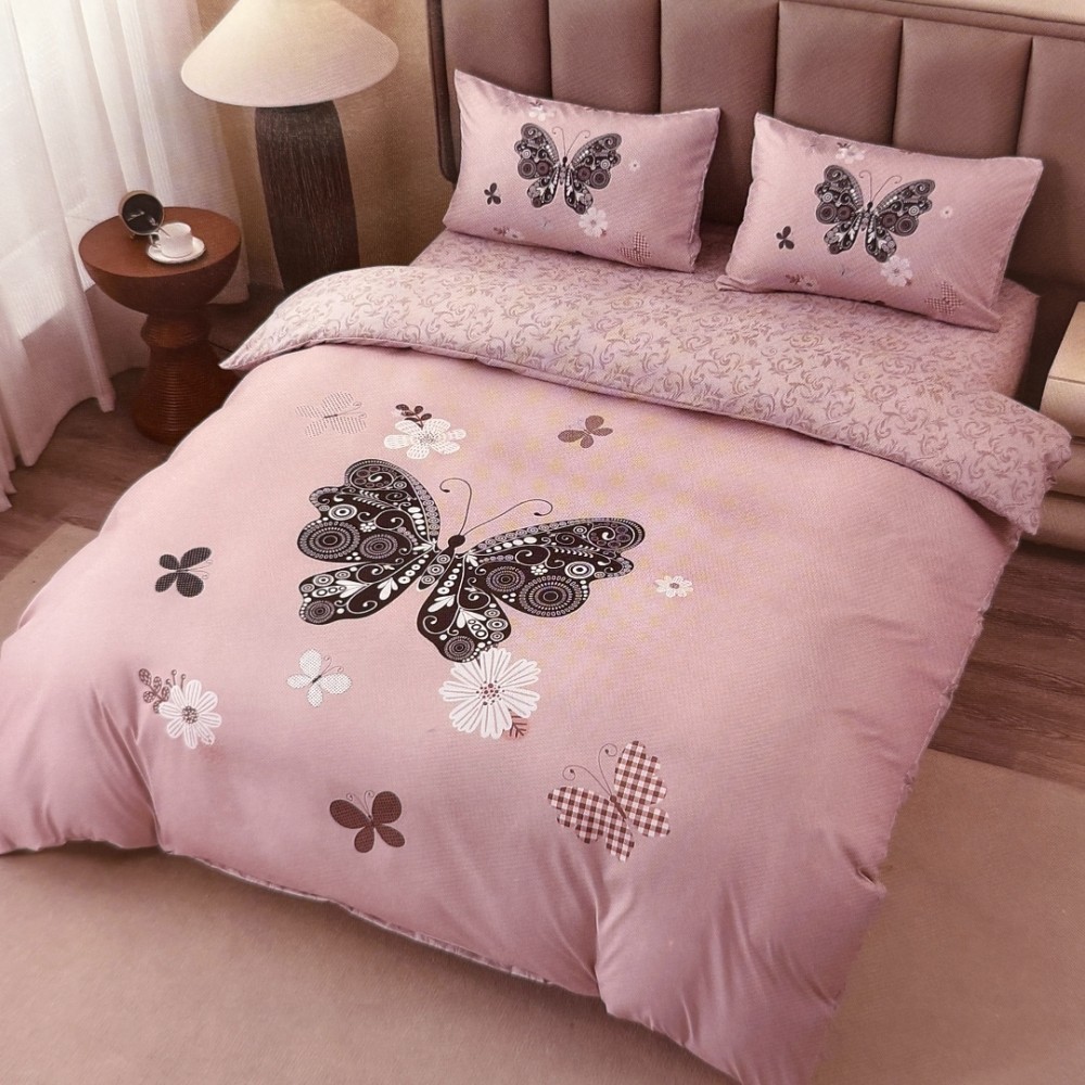 Lenjerie pat dublu, FINET, Imprimeu Digital 5D - Identic cu poza, Cu ELASTIC, 4 piese, Roz, Fluturi, cod produs: BCC-5DF-29