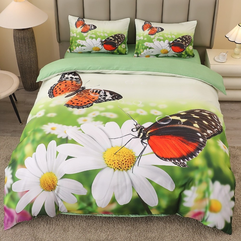 Lenjerie pat dublu, FINET, Imprimeu Digital 5D - Identic cu poza, Cu ELASTIC, 4 piese, Verde, Fluturi , cod produs: BCC-5DF-38