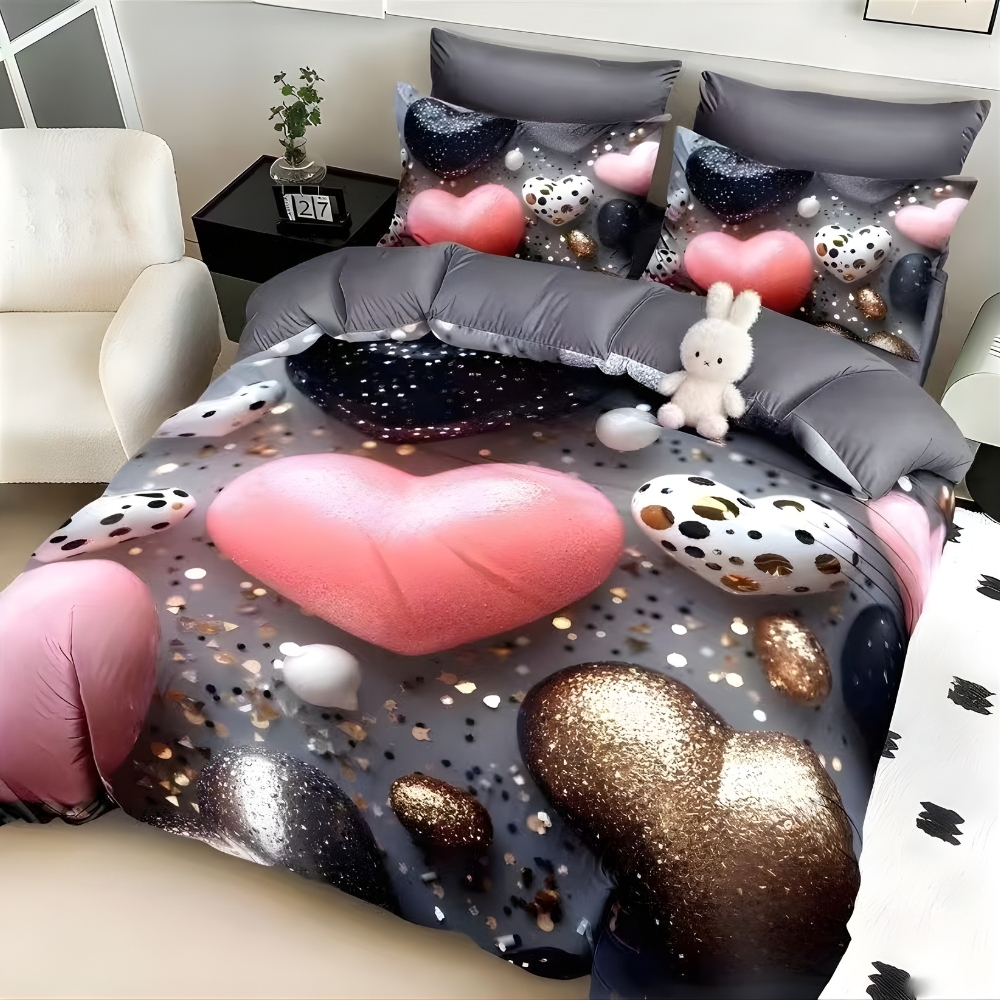 Lenjerie pat dublu, FINET, Imprimeu Digital 5D - Identic cu poza, Cu ELASTIC, 6 piese, Gri, inimioare, Talo, cod produs: SKT-5D-02