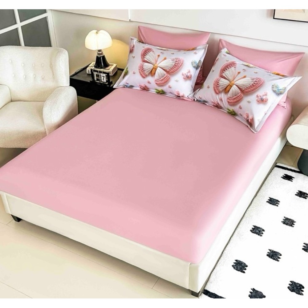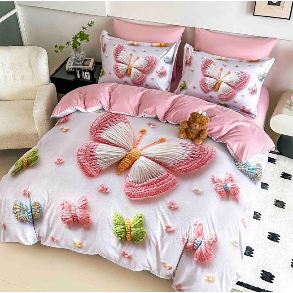 Lenjerie pat dublu, FINET, Imprimeu Digital 5D - Identic cu poza, Cu ELASTIC, 6 piese, Jojo Home, Alb, Roz, Fluturi, cod produs: JOJ-5DF-35