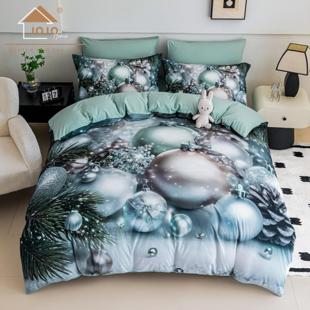 Lenjerie pat dublu, FINET, Imprimeu Digital 5D - Identic cu poza, Cu ELASTIC, 6 piese, Jojo Home, Gri, Verzui, Globulete, cod produs: JOJ-5DM-11