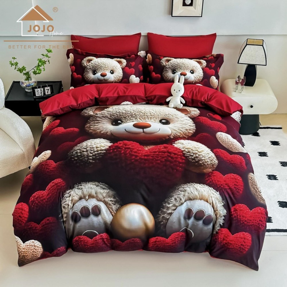 Lenjerie pat dublu, FINET, Imprimeu Digital 5D - Identic cu poza, Cu ELASTIC, 6 piese, Jojo Home, Rosu, Ursulet, cod produs: JOJ-5DF-03