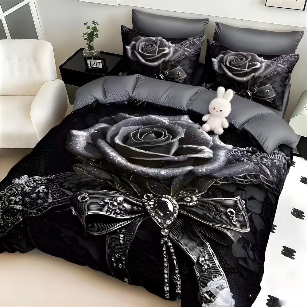 Lenjerie pat dublu, FINET, Imprimeu Digital 5D - Identic cu poza, Cu ELASTIC, 6 piese, Negru, trandafir, Talo, cod produs: SKT-5D-09