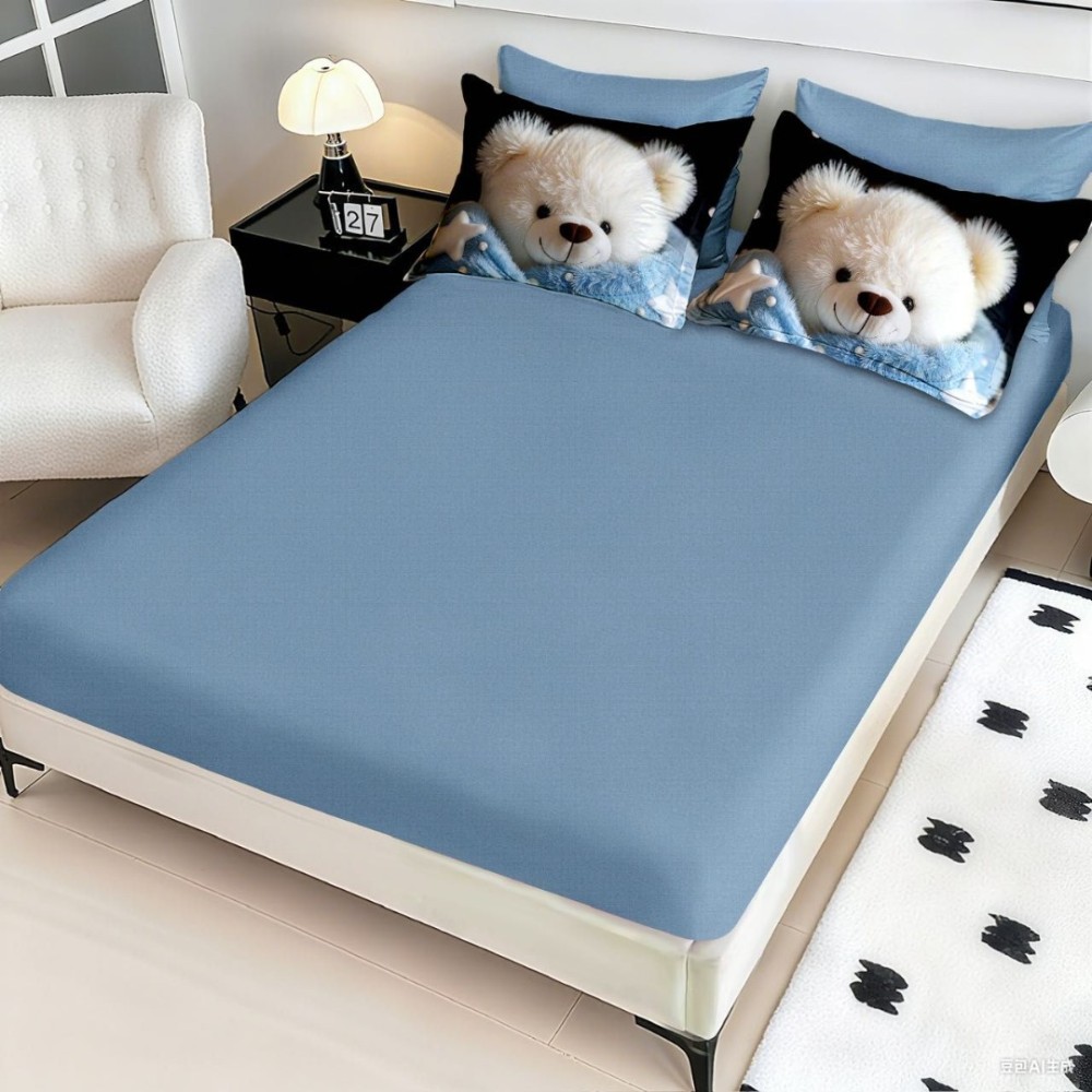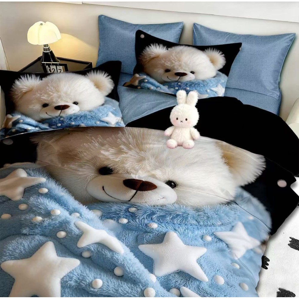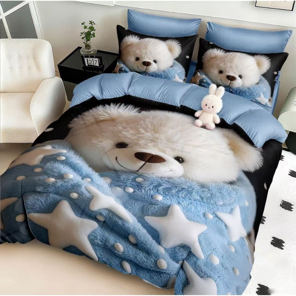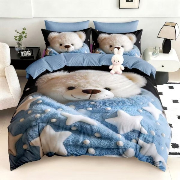 Lenjerie pat dublu, FINET, Imprimeu Digital 5D - Identic cu poza, Cu ELASTIC, 6 piese, Pucioasa, Albastru, ursuleti, Johny Home Pucioasa, cod produs: SPR-5D-08