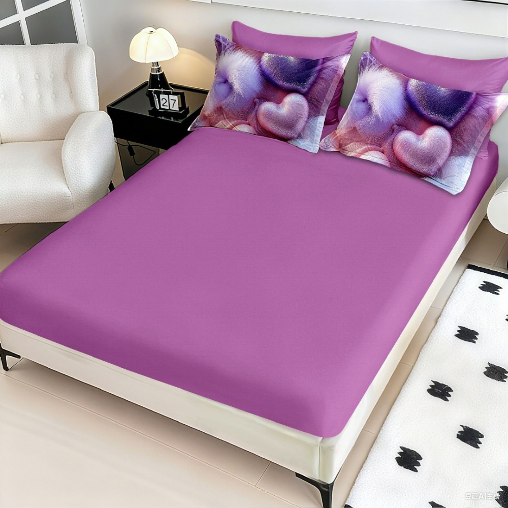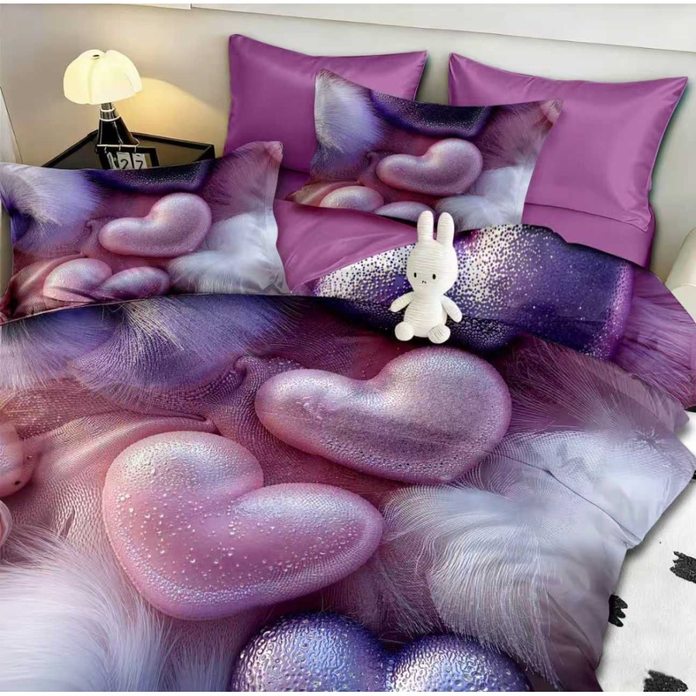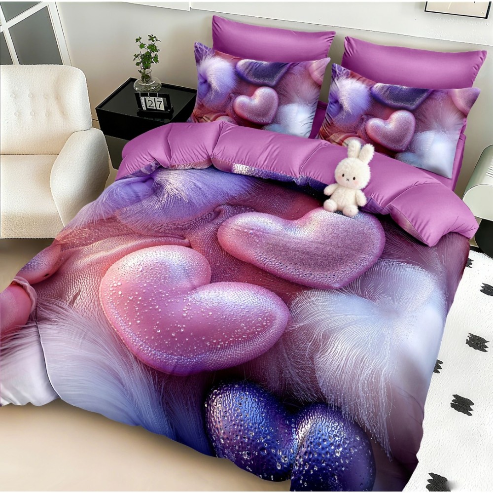 Lenjerie pat dublu, FINET, Imprimeu Digital 5D - Identic cu poza, Cu ELASTIC, 6 piese, Pucioasa, Mov, inimioare pufoase, Johny Home Pucioasa, cod produs: SPR-5D-03